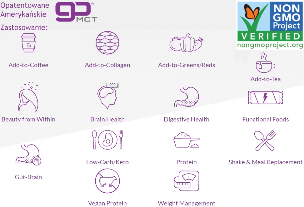 goMCT оптимізує виробництво кетонів, менш окисного джерела енергії. Він забезпечує організм здоровими жирами для природної та тривалої енергії без подальшого «збою». Він також містить клітковину акації, пребіотик, який підтримує здоров’я кишечника. MCT і клітковина акації разом допомагають оптимізувати вісь кишечник-мозок. goMCT містить чисті C8 і C10 MCT, найбільш ефективні в перетворенні в кетони. В основному використовується як порошок у кето-продуктах, функціональних продуктах харчування (тобто батончиках) і в комбінаціях, таких як колаген або кава, можливості безмежні.