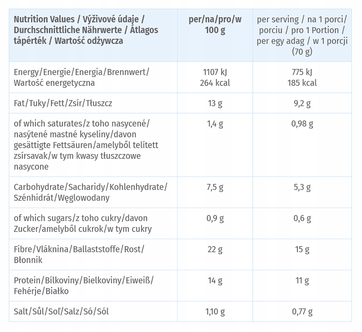 білковий хліб з високим вмістом білка та дієтичного волокна, вирізаним. Упаковано в захисну атмосферу. , гороховий білок, білок молоко ), коричневе насіння льону, житове борошно вуллероб, шліфування соя , соєве борошно , Бран пшениця , Золоті насіння льону, насіння соняшнику, кунжут , вівсяна волокна, кухонна сіль, хлібобулочні дріжджі, регулятор кислотності: яблучний оцет.