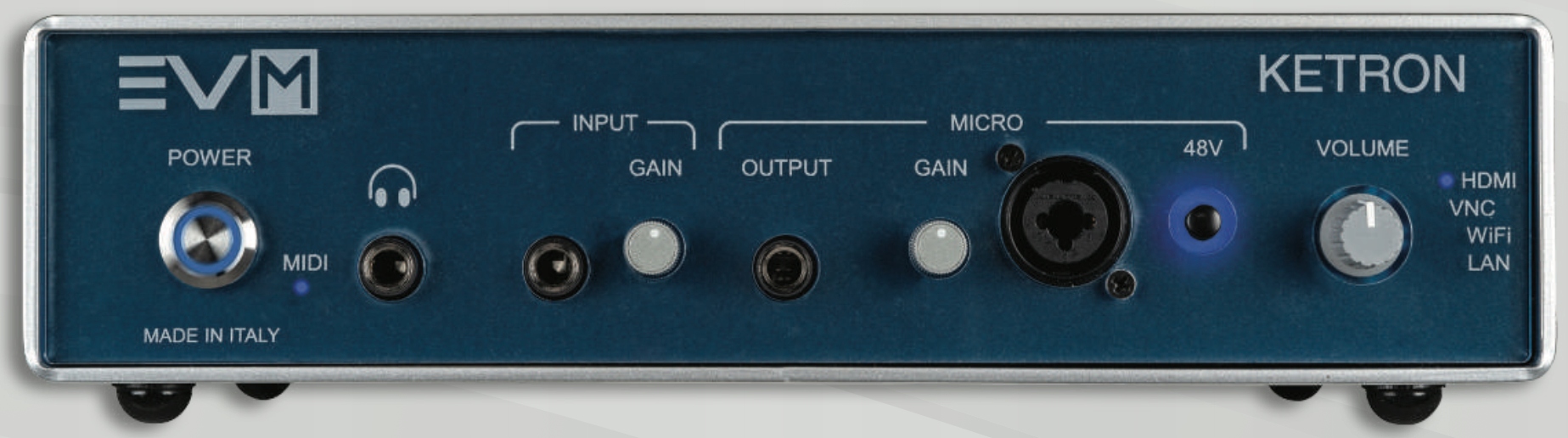 У невеликих розмірах 27 на 20 на 6 см, Ketron EVM містить у собі всю суть потужного інструменту Ketron Event. Завдяки використанню бездротової технології музикант може підключити Ketron EVM до планшета Android, iPad або комп’ютера простим та інтуїтивно зрозумілим способом. Це рішення усуває необхідність використання кабелів або фізичних панелей керування, що є очевидним кроком до мобільності та сучасності.