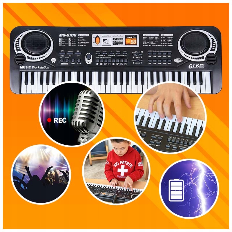 Клавіатура з мікрофоном – ідеальний інструмент для гри та навчання грі на піаніно b> . Обладнання має 61 міні-клавішу (5 октав), 16 звуків, 10 ритмічних мінусовок, барабанні кнопки для самостійного відбивання ритму, вбудовані -в режимі уроку, а також можливість записувати і пізніше відтворювати музичні фрази. Крім того, ці електронні органи можна живити від електричної розетки або працювати від чотирьох батарей AA, що робить їх повністю портативними.
