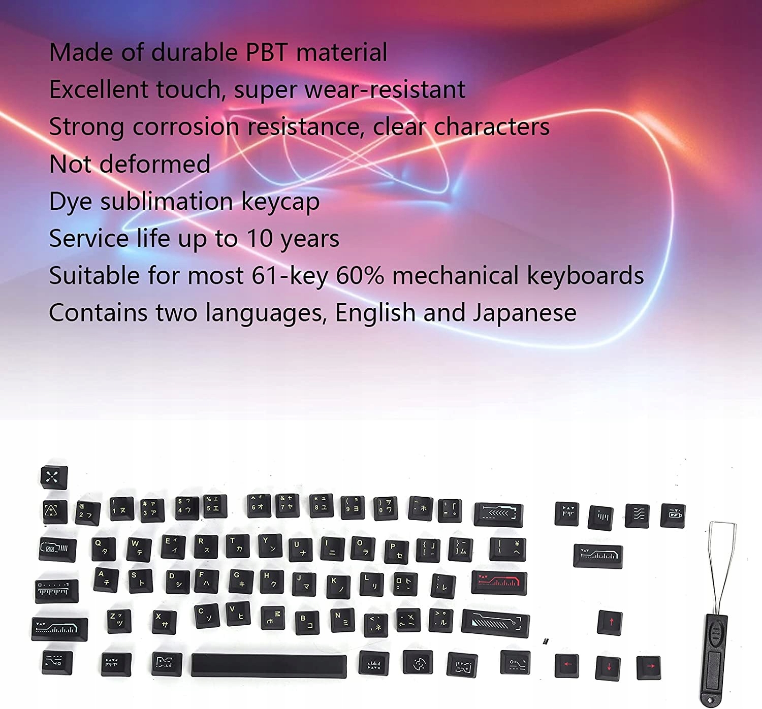 У зносостійкій лінійній клавіатурі використовується міцний матеріал PBT із чудовим дотиком, надзвичайно зносостійкий, сильний до корозії, виразний характер, спеціальна технологія малювання без деформації. Хороша сумісність Keycap, підходить для більшості механічних клавіатур 61key 60, таких як RK61 GH60 IQUIX F60 GK61 GK64 Annie 60 series тощо. Висока якість Використовуйте сублімаційне проникнення кольору клавіатури на клавішну стрічку Термін служби становить 10 років без вицвітання. Користувачі можуть використовувати його без будь-яких турбот і насолоджуватися дизайном.Зручність У набір входить ящик для ключів, який дуже зручний, щоб допомогти користувачам замінити ключ. Кілька мов Містить дві мови. Ключі англійської та японської придатні для написання цих двох мов.