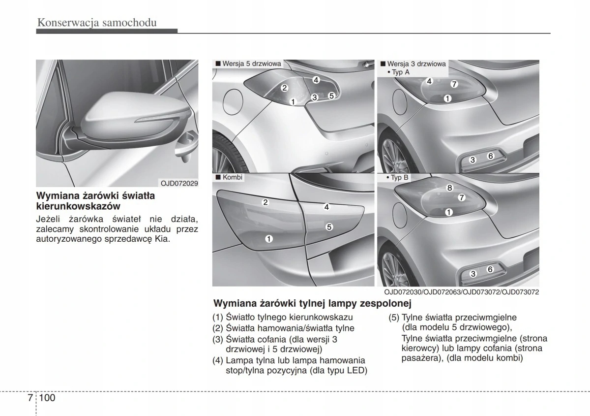 Посібник з експлуатації Kia містить усі версії обладнання та корисну інформацію про ефективне та безпечне використання автомобіля, наприклад, індикатори, контрольні лампи, відкривання та закривання, освітлення та видимість, сидіння, відділення для речей, опалення, вентиляція, кондиціонування повітря - водіння, поради з експлуатації, технічне обслуговування автомобіля - рівень рідини, перевірка та доливка, екстрені операції, заміна коліс, запобіжників, заміна лампочок - технічні дані... та багато іншого, що дає відчуття безпеки та комфорту мандрівникам. Польське законодавство зобов’язує продавця додавати до автомобіля інструкцію з експлуатації польською мовою. Посібник з експлуатації автомобіля новий і польською мовою.