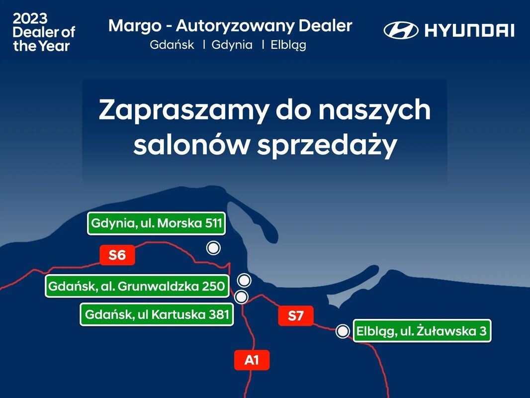 Hyundai Margo-найбільший уповноважений дилер Hyundai на півночі Польщі (у нас є наші гілки в Померанській та Валійсько-Масурійській воєводіні). Ми - сімейна компанія, яка має понад 30 -річний досвід роботи в автомобільній промисловості.