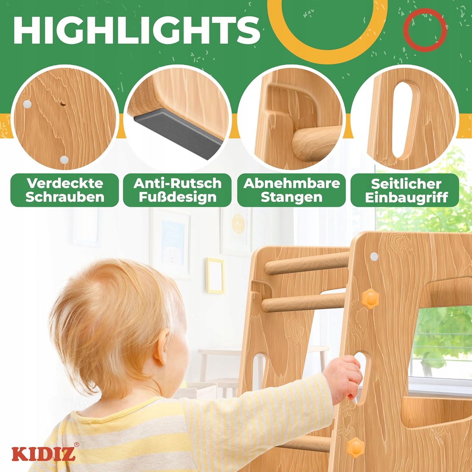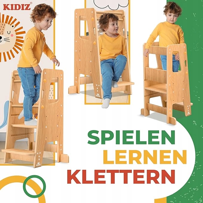 - Безпека: стійка конструкція з масиву сосни та нековзні ніжки забезпечують стійкість від перекидання. Навчальна вежа витримує навантаження до 50 кг і завдяки міцній конструкції забезпечує стійке утримання. Широка базова поверхня та оточуючі захисні стрижні запобігають падінню збоку або вперед і захищають дітей від 12 місяців. Інтегрована перекладина додатково стабілізує конструкцію та підвищує стійкість.