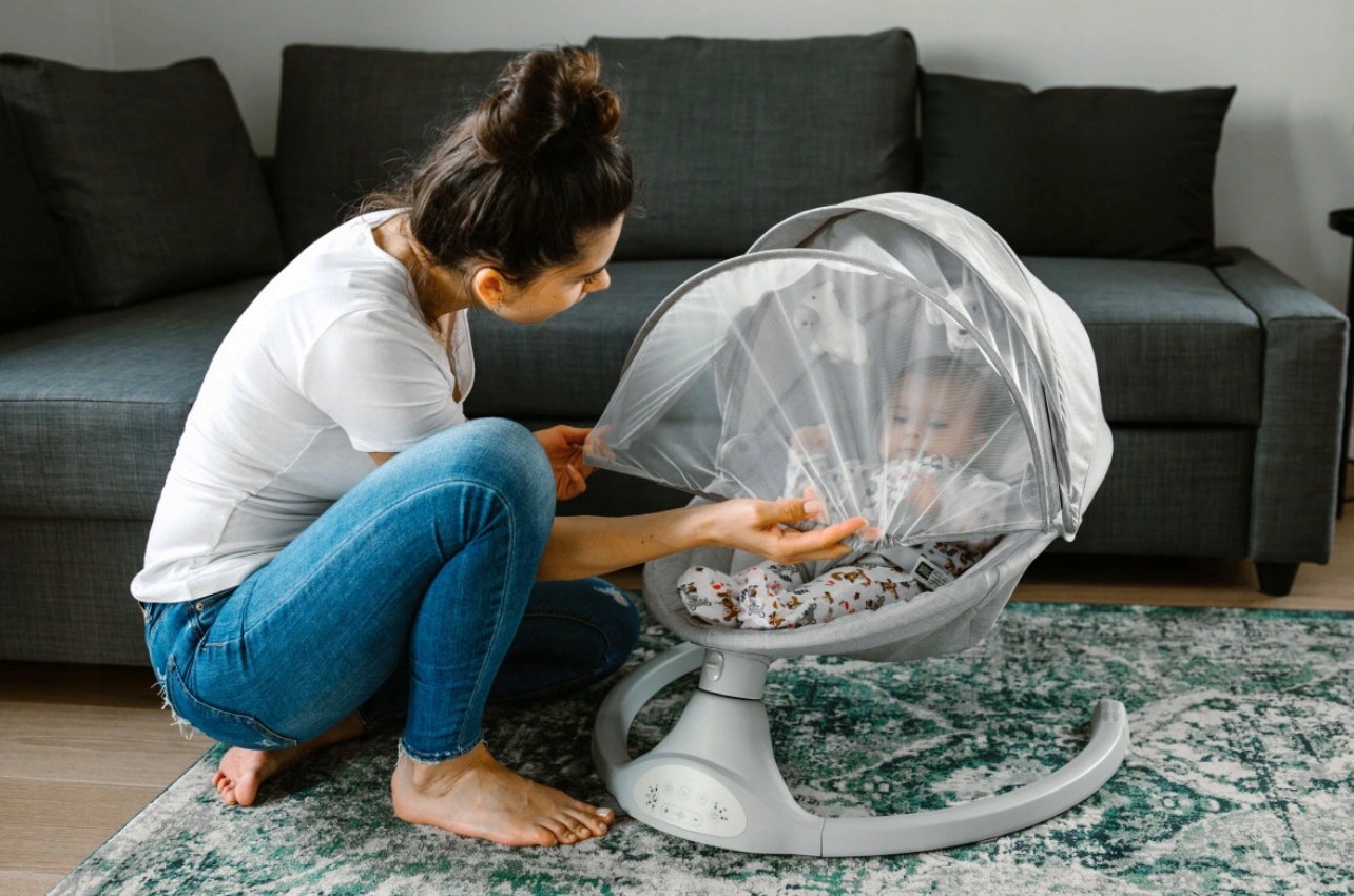 - Прикріплений капюшон забезпечить захист вашої дитини від небажаних подразників - протягів, сонця, надмірних рухів, чудово підходить для використання качалок на терасі або балкон