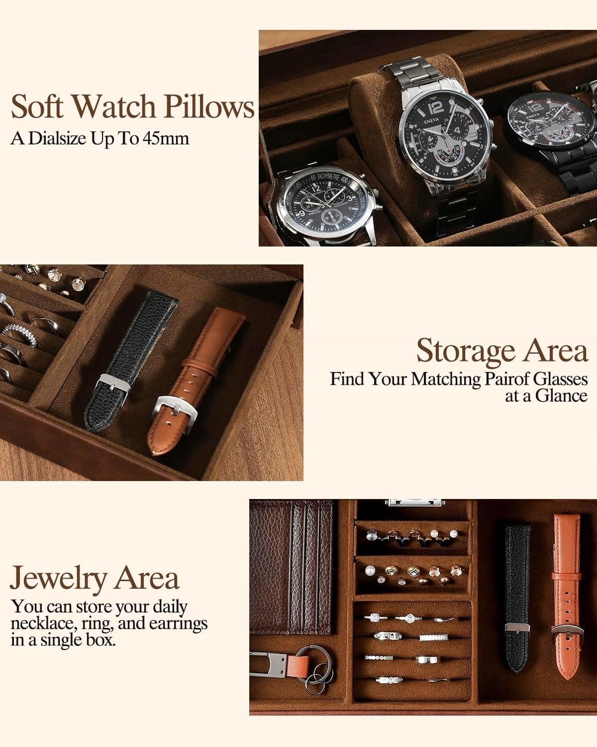 [двошарова, велика ємність] 12 місць на верхньому шарі, набиті оксамитовою тканиною, ящик внизу з ювелірними відсіками.