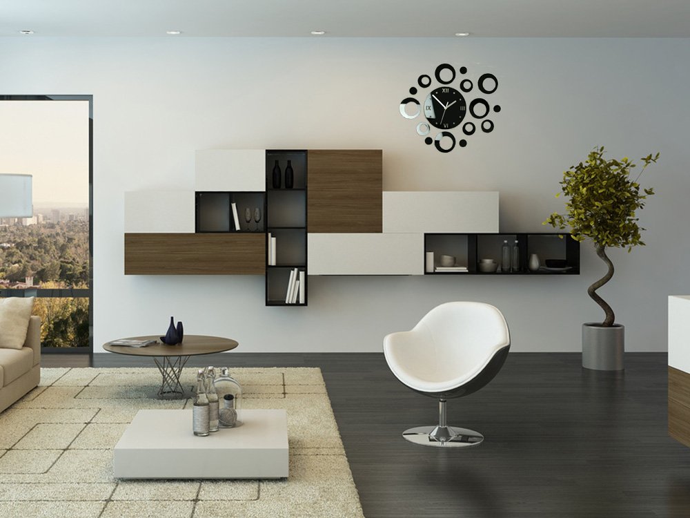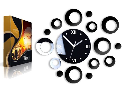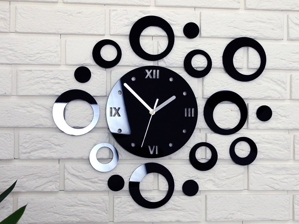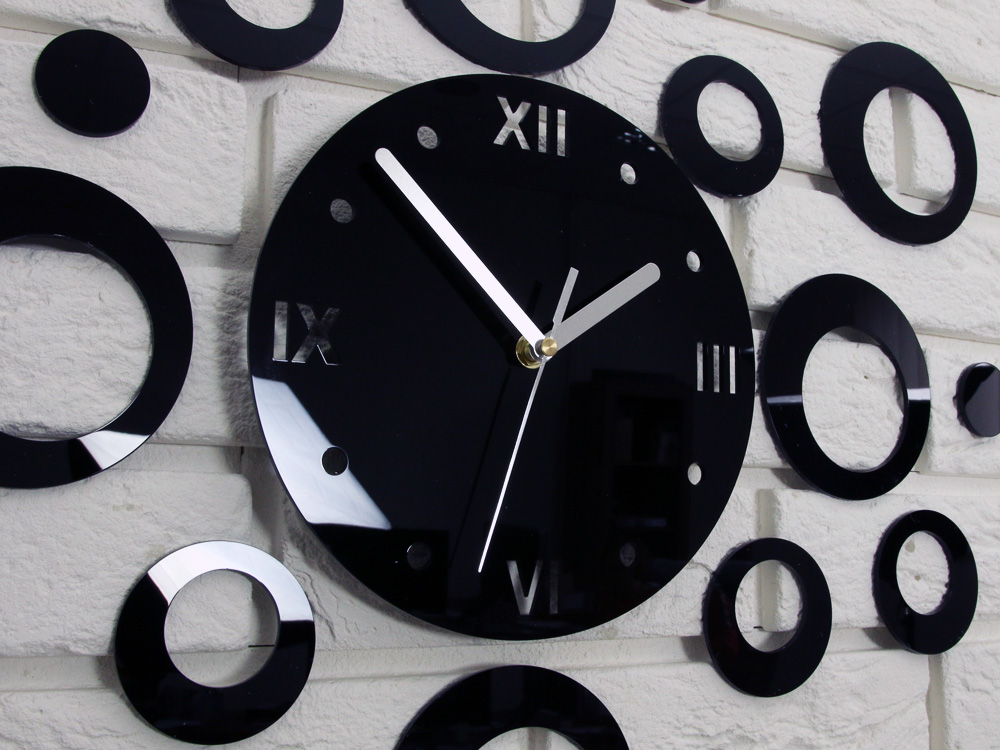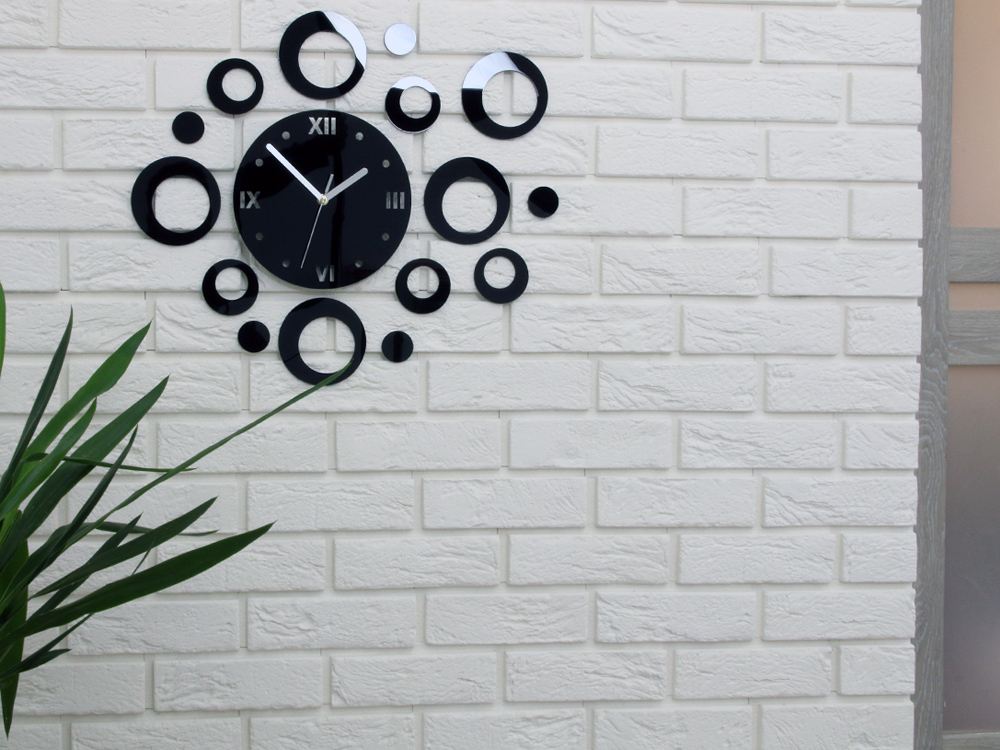 Встановити годинник швидко і зручно. Циферблат зі стрілками можна закріпити на гачку. Декоративні елементи кріпляться до стіни за допомогою монтажної стрічки. Кожен елемент проклеюється скотчем. Годинник має шаблон - завдяки йому можна точно розташувати елементи на стіні.