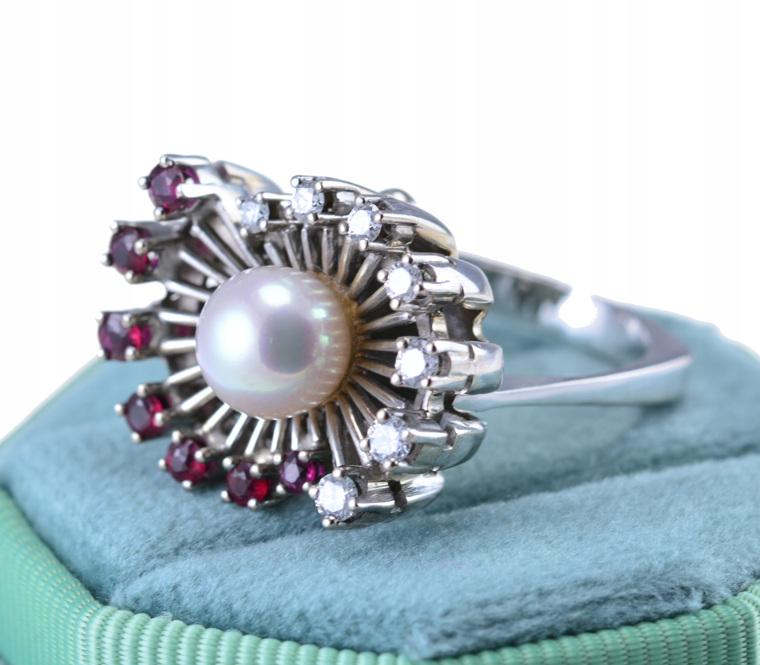 Предмет продажу каблучка та кулон 2 в 1. Після від'єднавши рейку, корону кільця можна носити як кулон. Каблучка прикрашена натуральними рубінами вагою 0,31 ct, діамантами вагою 0,2 ct з параметрами Vs/G-I і культивованою перлиною діаметром 7 мм. Розміри корони та кулона 20×12 мм.