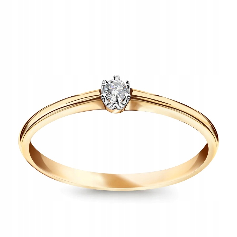 Кільце, прикрашене діамантом вагою 0,03 карата, виготовлене із золота 585 проби, підтверджене Польським пробірним бюро.
