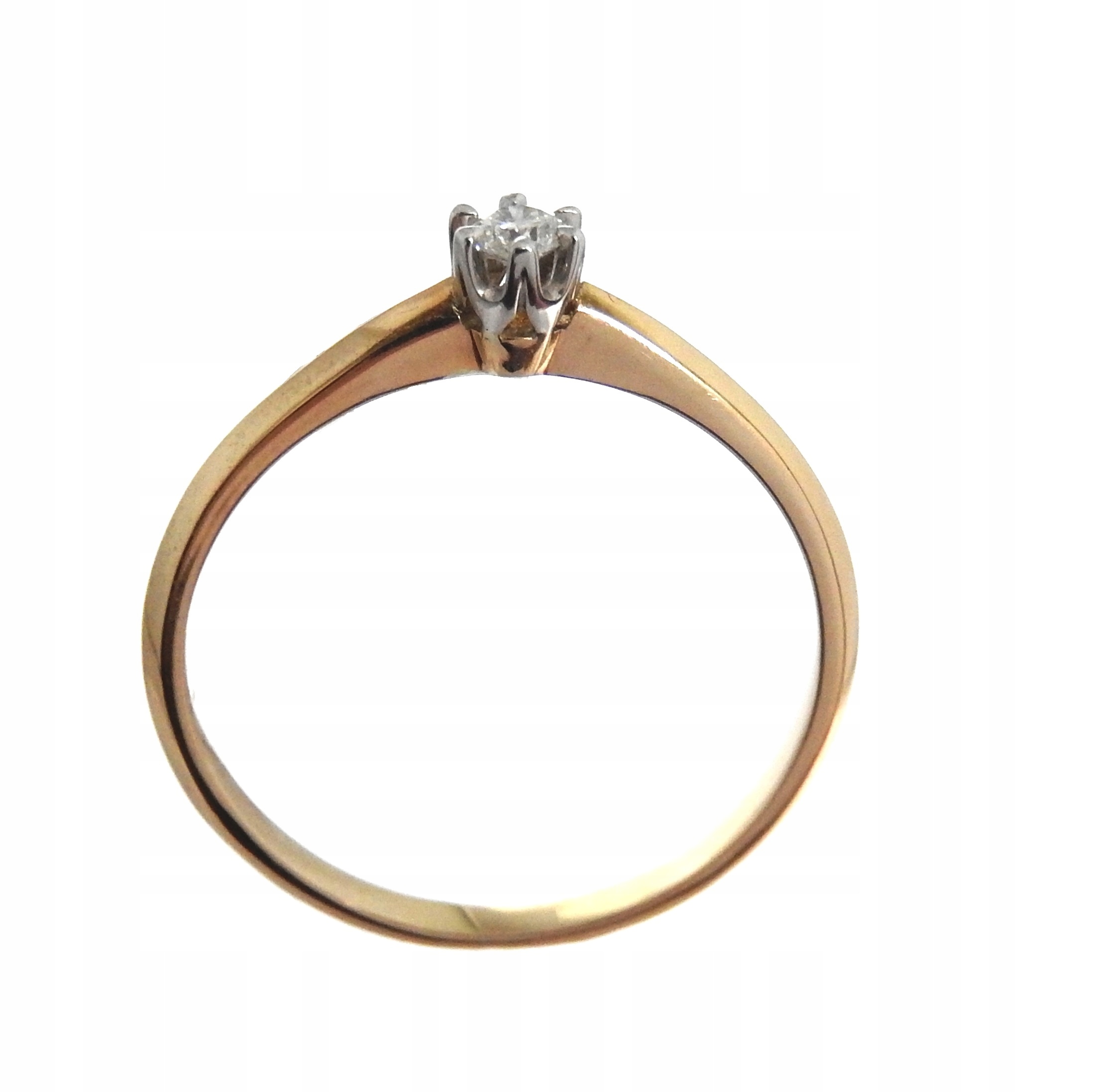 Кільце, прикрашене діамантом вагою 0,08 карата, виготовлене із золота 585 проби, підтверджене Польським пробірним бюро.