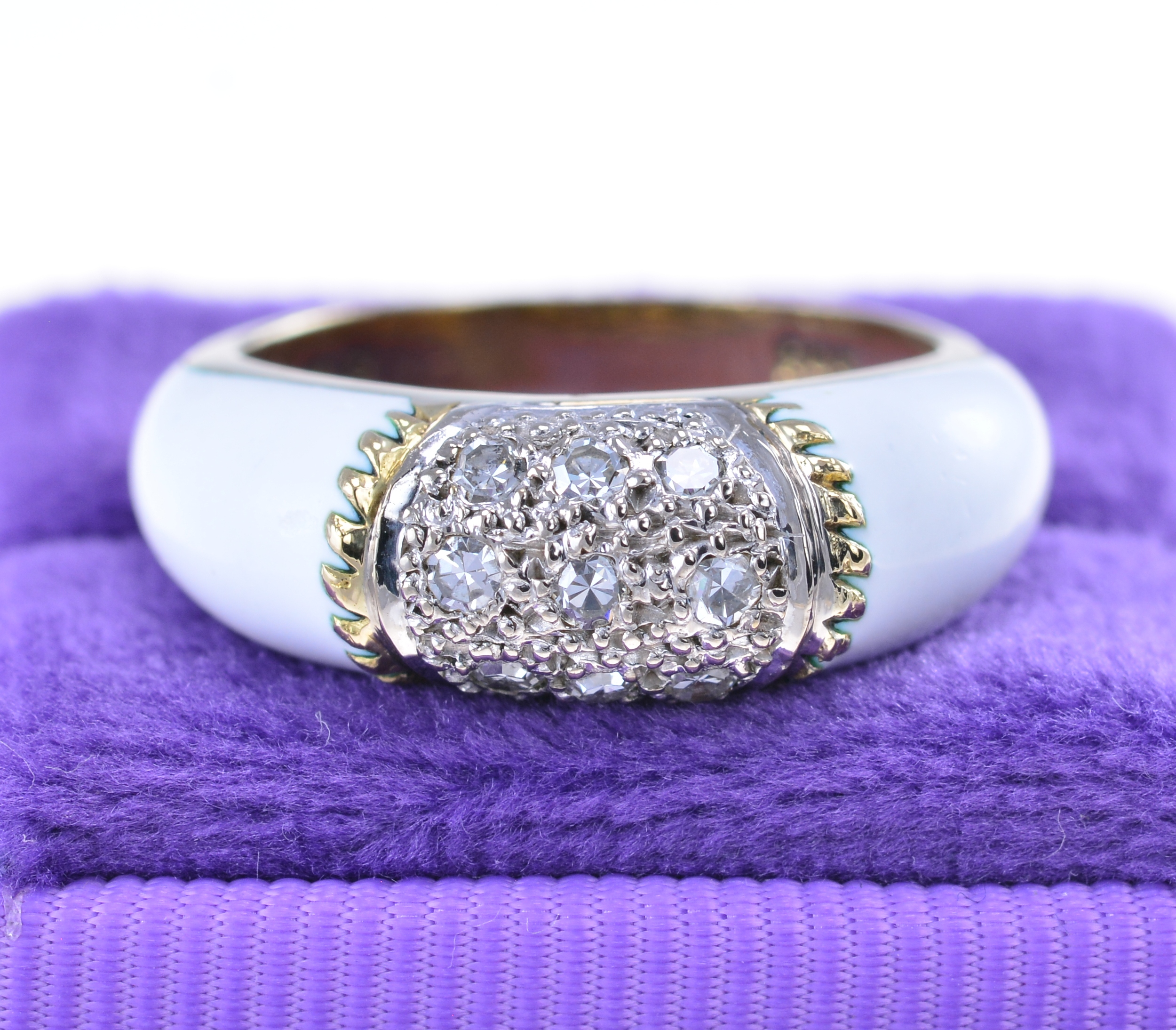 Предмет продажу каблучка із золота вищої проби, оздоблена біла емаль і діаманти огранювання «вісімка» загальною вагою 0,18 карата. Каблучка має французькі клейма.