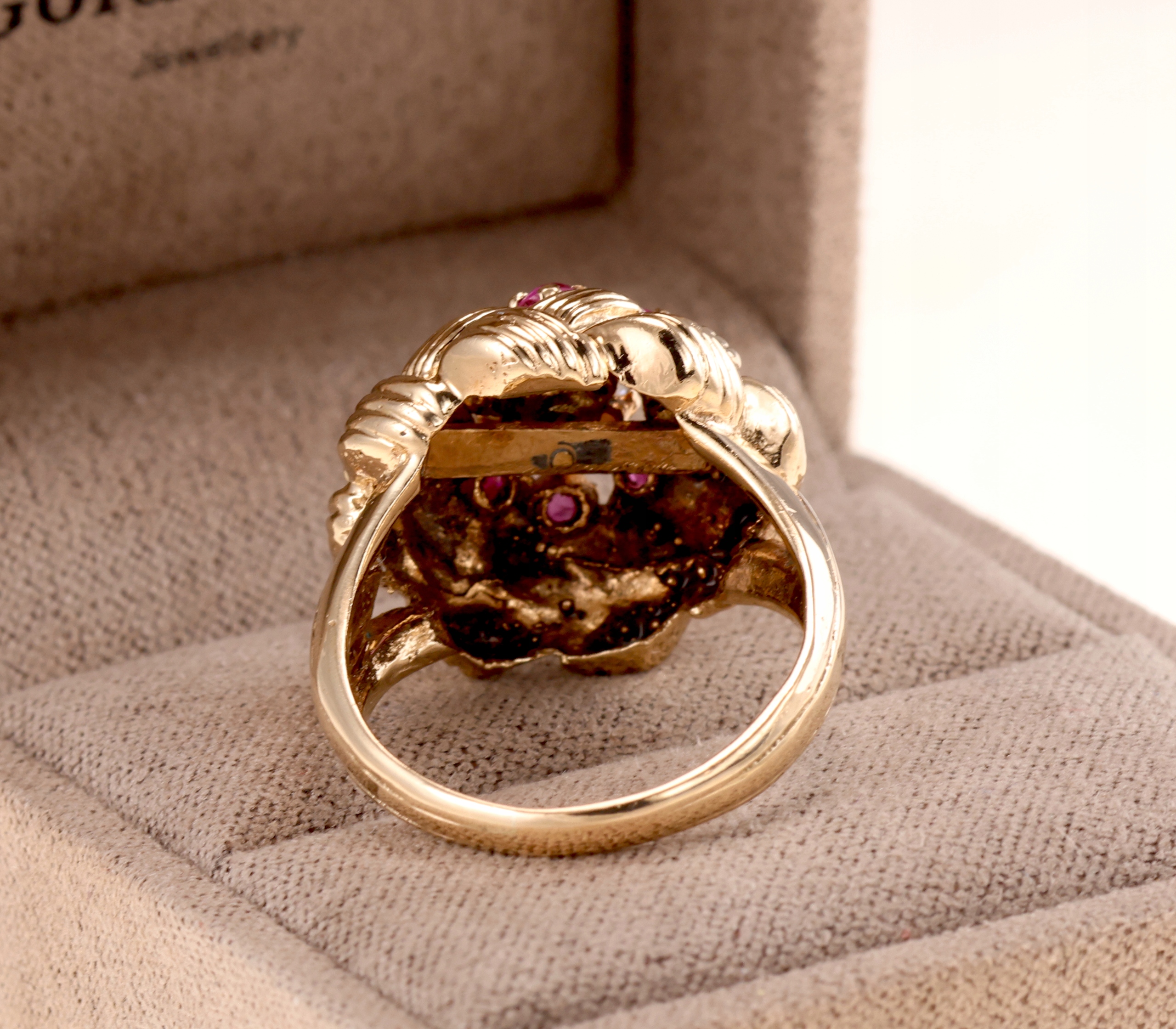 Предметом продажу є вінтажна каблучка із золота 9К. Вражаюча корона у вигляді плетеного кошика діаметром 19 мм прикрашена рубінами загальною вагою 0,58 карата та прісноводними перлами.
