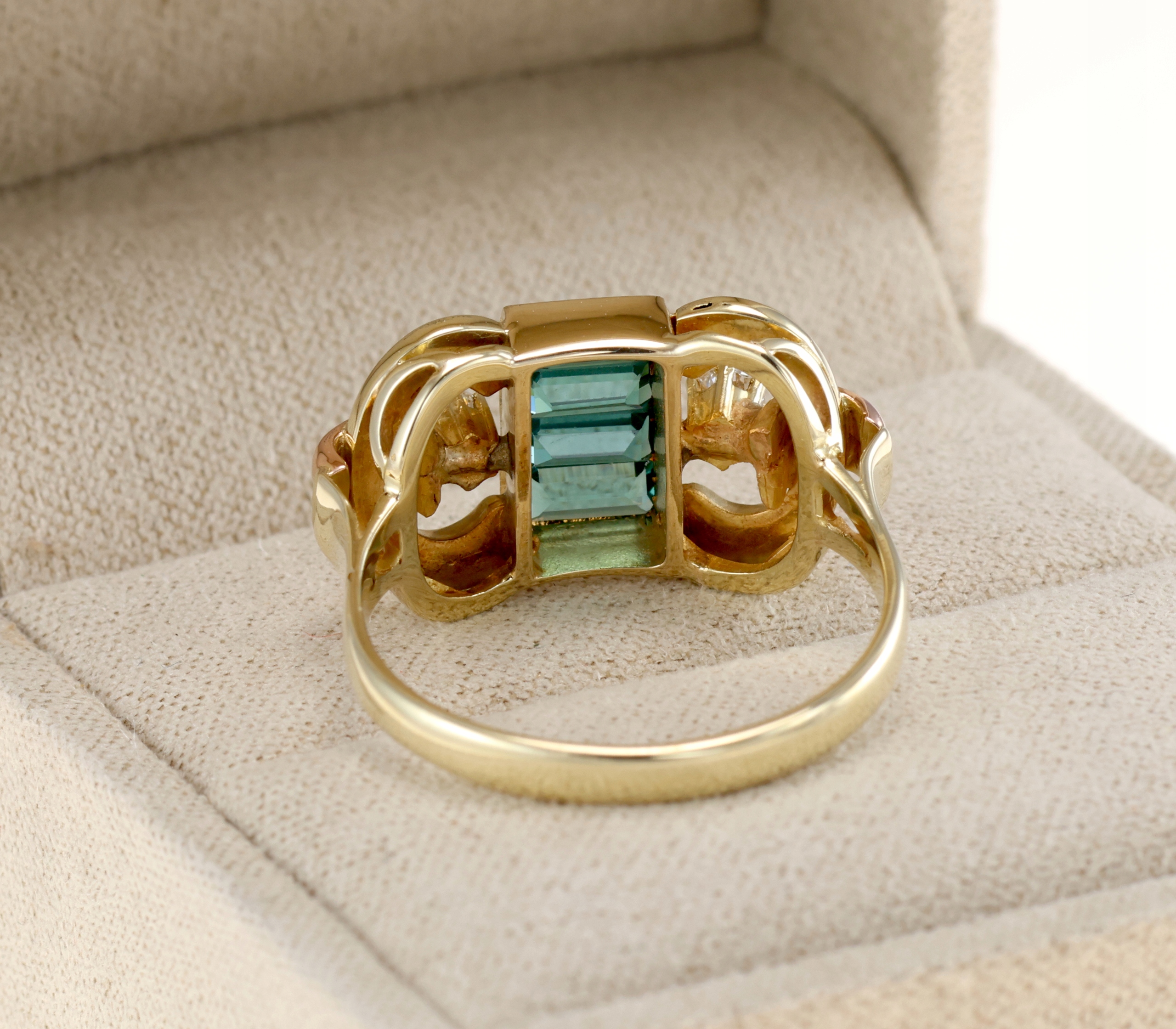 Предмет продажу золоте кільце 585 проби з декором з пляшкою зелений турмалін. З боків сяють два діаманти, додаючи композиції блиск і легкість. Делікатні елементи рожевого золота порушують класичну форму, надаючи їй унікальний характер.