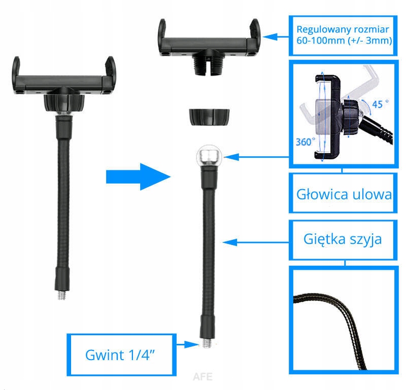 - тримач для телефону з кульовою головкою та гнучкою шийкою