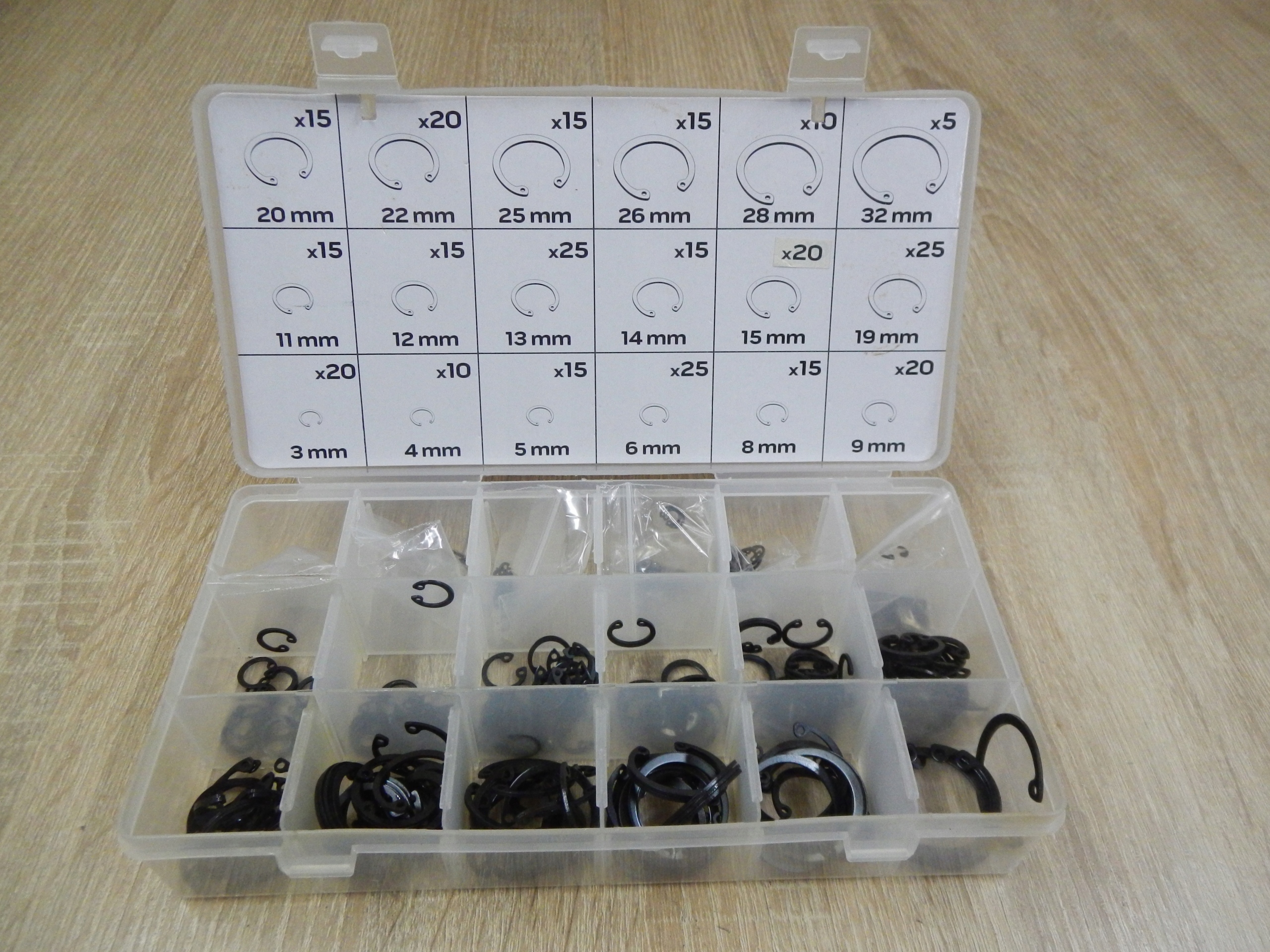 - В набір входять внутрішні сегерні кільця: 20 х 3 мм, 10 х 4 мм, 15 х 5 мм, 25 х 6 мм, 15 х 8 мм, 20 х 9 мм, 15 х 11 мм. мм, 15 x 12 мм, 25 x 13 мм, 15 x 14 мм, 20 x 15 мм, 25 x 19 мм, 15 x 20 мм, 20 x 22 мм, 15 x 25 мм, 15 x 26 мм, 10 x 28 мм , 5 x 32 мм