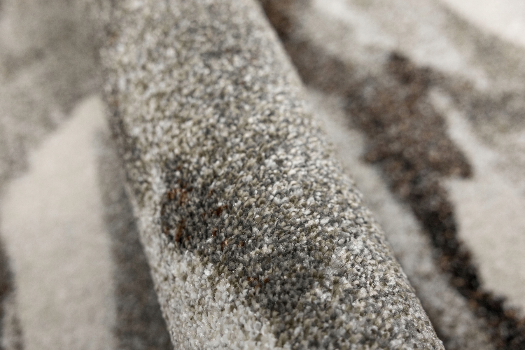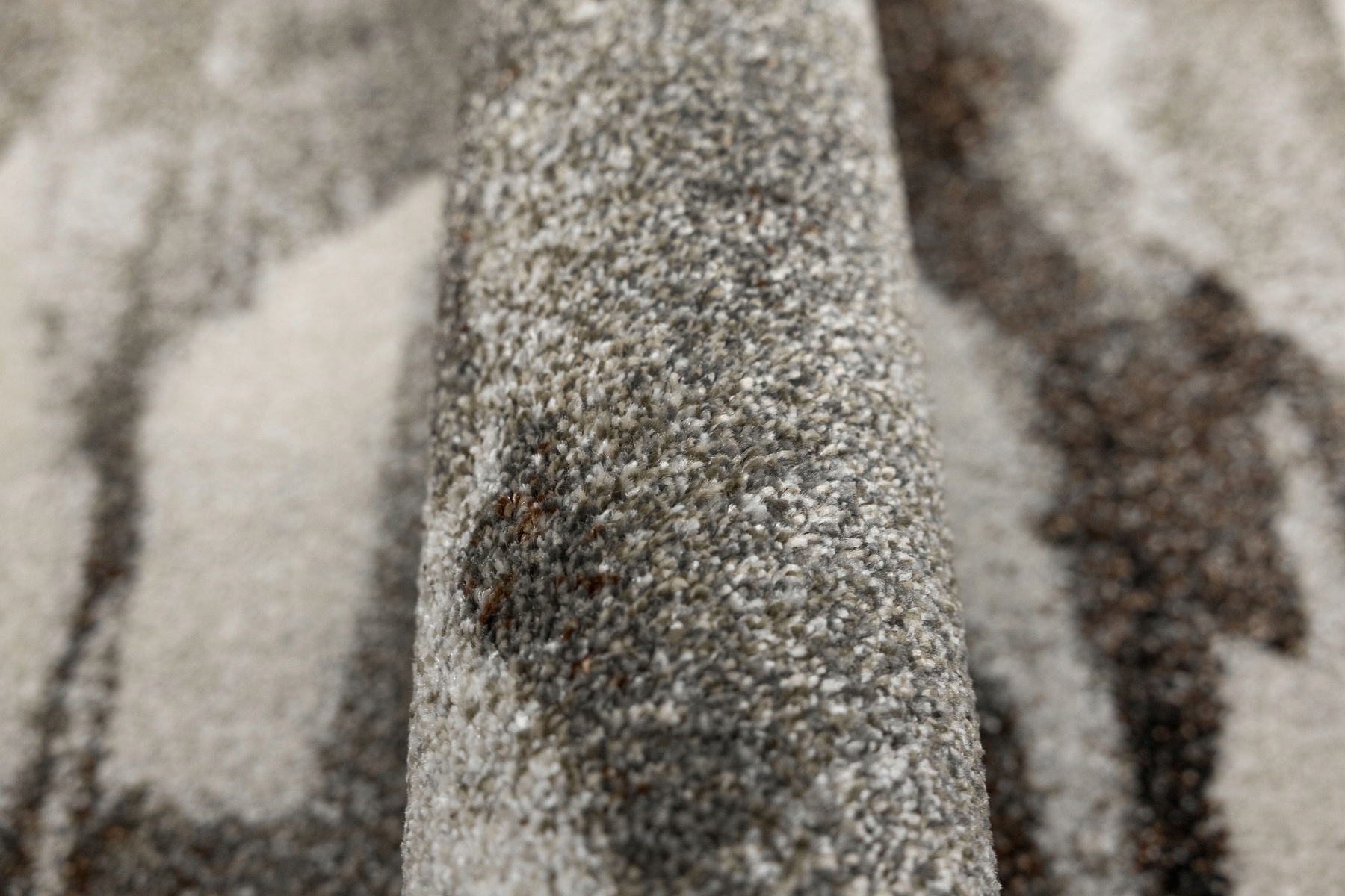 М'який і приємний на дотик килим Ponte з ворсом, прикрашений сучасним потертим візерунком сірого кольору з акцентами кремового, сріблястого, бежевого, коричневого та чорного кольорів. Низ оброблений джутом.