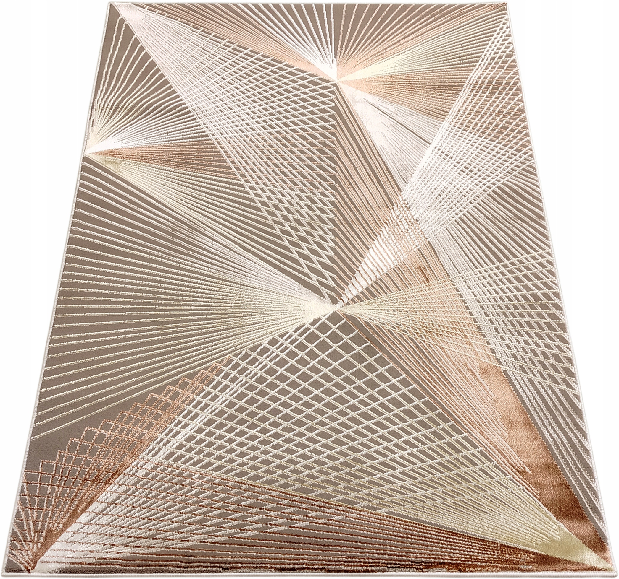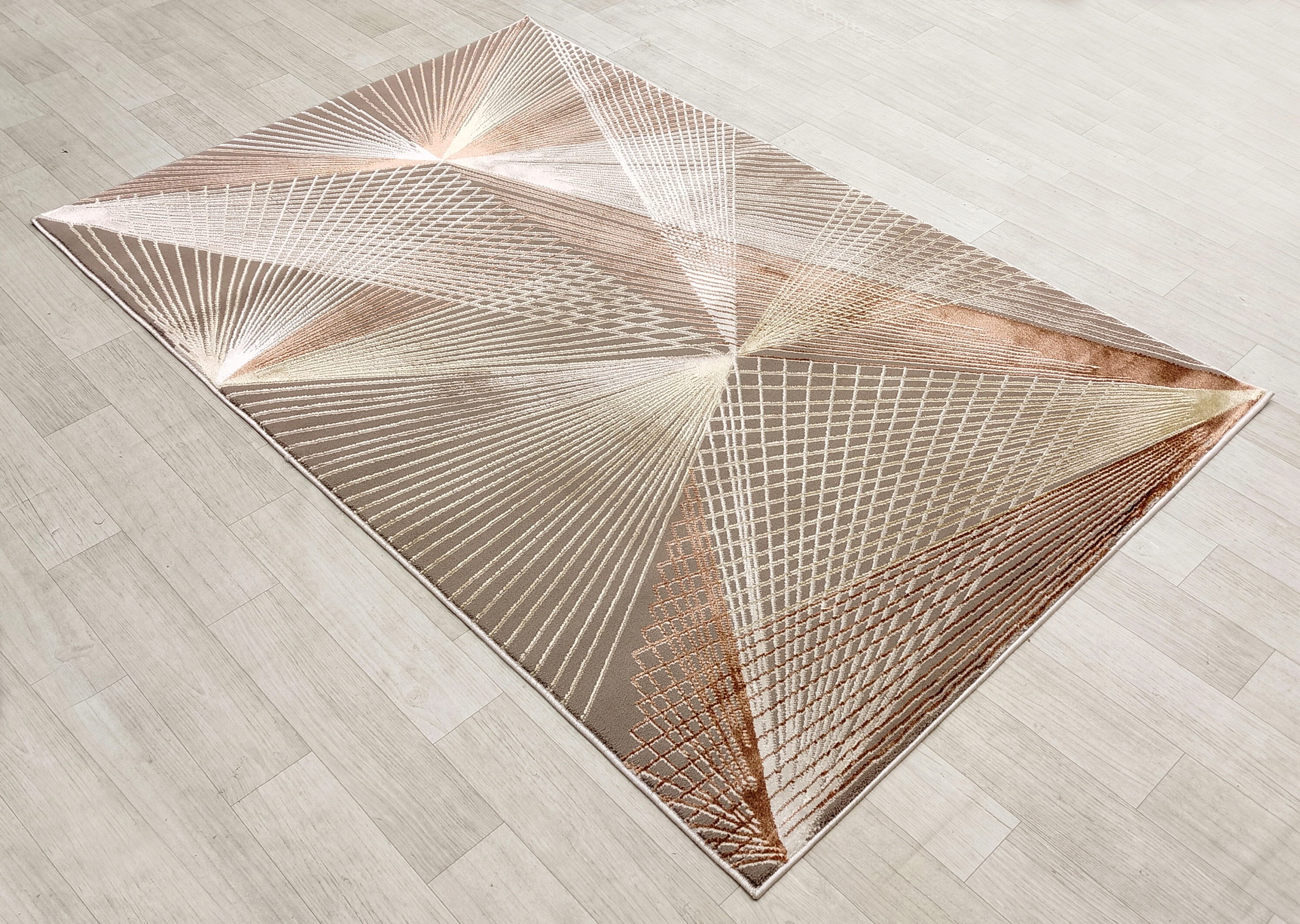 Завдяки творчій концепції та високій якості виготовлення, цей поліестеровий килим з геометричний сучасний візерунок і блискучі нитки з додаванням мідного кольору не тільки відповідають практичним потребам, але й додають інтер’єру неповторний характер і елегантність.