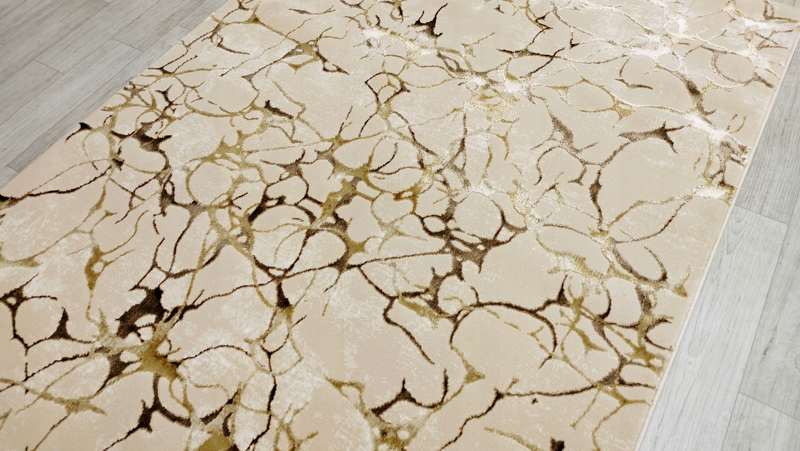 Бежевий колір килима надає йому нейтральний характер, який ідеально вписується в різні декоративні стилі. Золоті та бронзові елементи переливаються на світлі, створюючи вражаючий ефект, який привертає увагу.