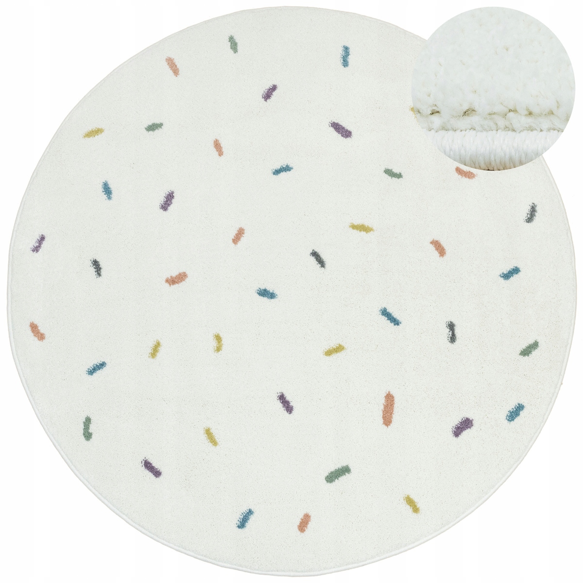 Куглий дитячий килимок з колекції Lima радує своїм веселим малюнком. Він складається з різнокольорових ліній, які нагадують цукрову посипку на десерті. Яскрава і позитивна колірна гамма включає кремовий фон і елементи злегка пастельних відтінків фіолетового, рожевого, синьо-жовтого, сірого і зеленого. Світла палітра кольорів і злегка блискучий м'який фліс створюють модне і практичне доповнення до облаштування дитячих кімнат.