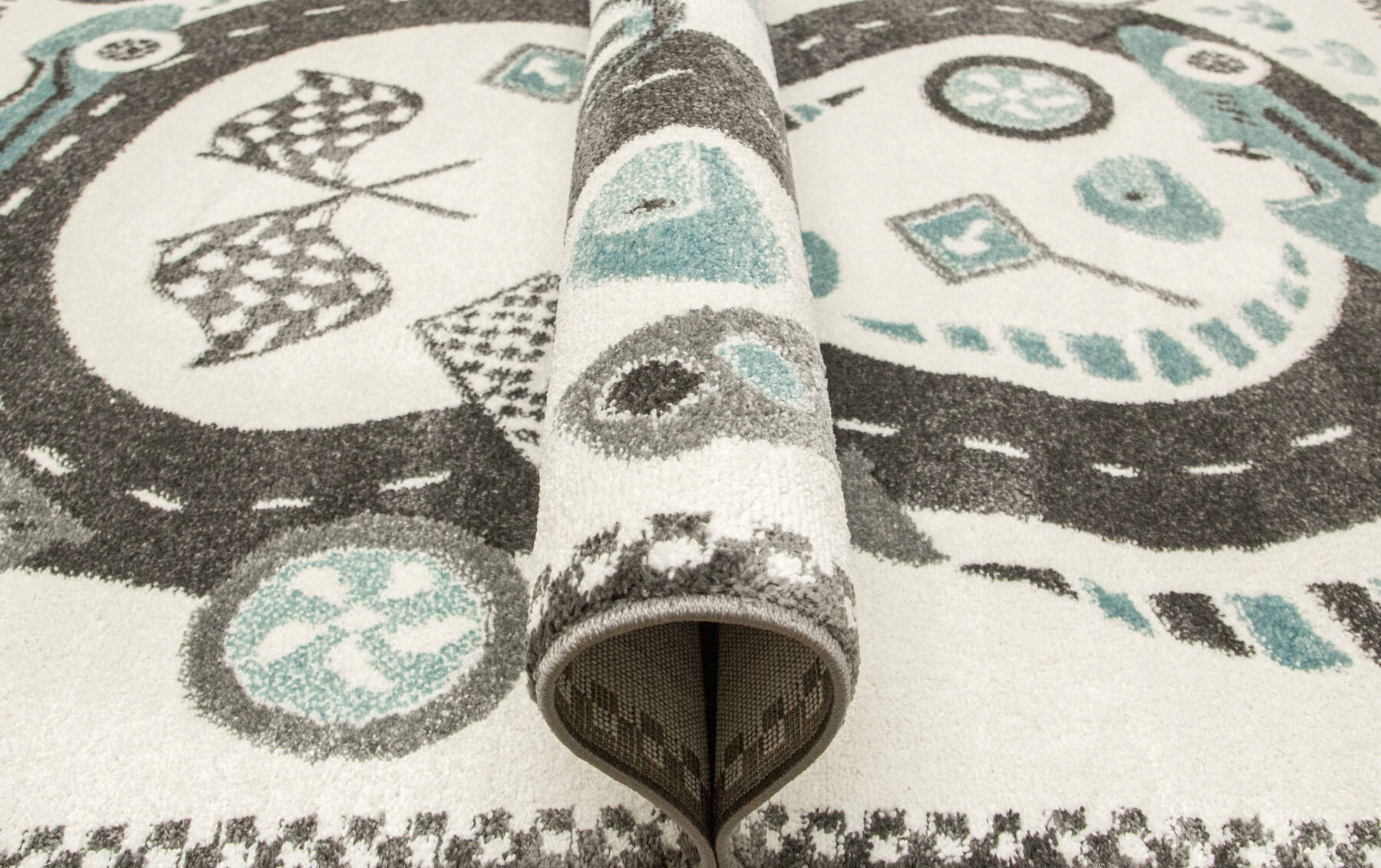 Дитячий килимок Lima демонструє гоночний мотив, який неодмінно порадує юних любителів автомобілів. Чорна кручена гоночна траса виділяється на кремовому тлі, навколо якої розташовані різні елементи, пов'язані з тематикою гонок: машини, прапори, дорожні знаки, кубки, шоломи, заправки, а також годинник і кермо. Відтінки сірого, синього і чорного надають візерунку динамічний і енергійний характер, зберігаючи при цьому стримані кольори. Килим є ідеальним доповненням до дитячої кімнати, стимулює уяву та заохочує грати у світ автомобільних перегонів.