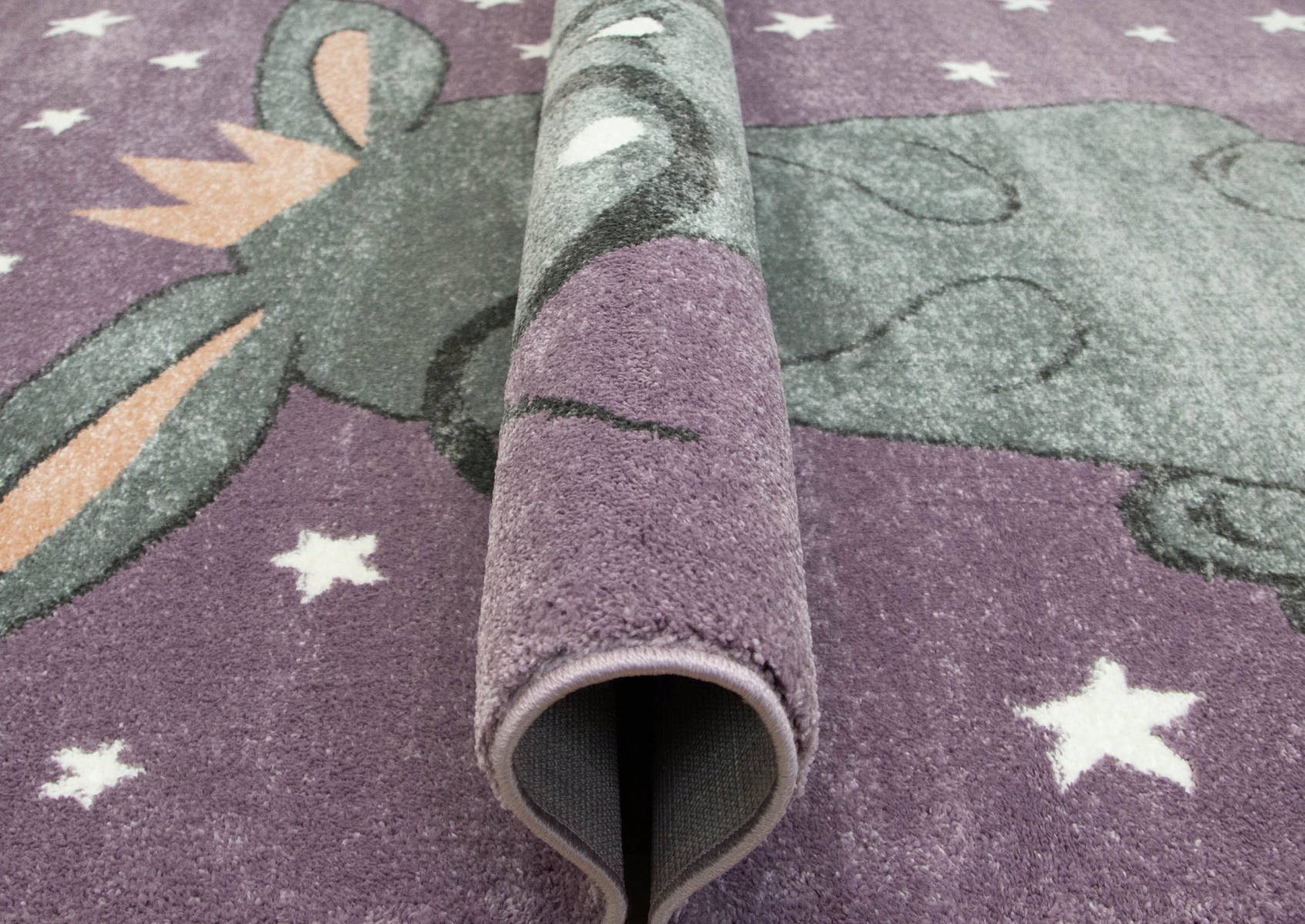 килим lima чарівний мотив із фігурою сірого зайчика, який носить великі круглі окуляри, що надає йому смішного та доброзичливого вигляду. Додатковим акцентом є корона в делікатному рожевому відтінку, розміщеному на голові зайчика, який підкреслює дитину та фантазійний характер візерунка. Фон килима зберігається в приглушеному фіолетовому кольорі, на якому розкидані маленькі білі зірки, що нагадує нічне небо. Ця композиція створює теплу і приємну атмосферу, яка буде ідеальною в дитячій кімнаті. Поєднання пастельних кольорів - сірого, фіолетового та рожевого - робить килимок, що відповідає інтер'єру в приглушених кольорах, надаючи їм затишок та казкову частину.