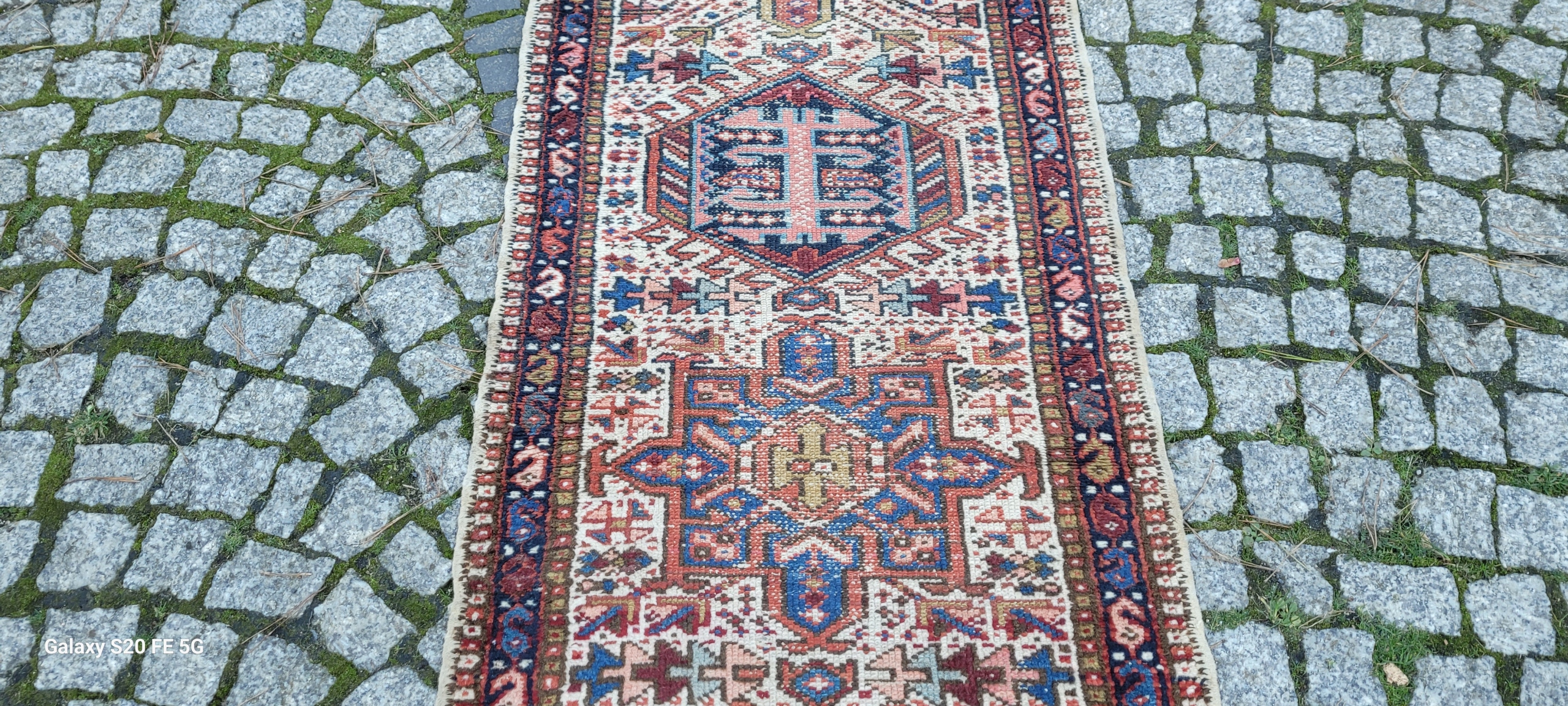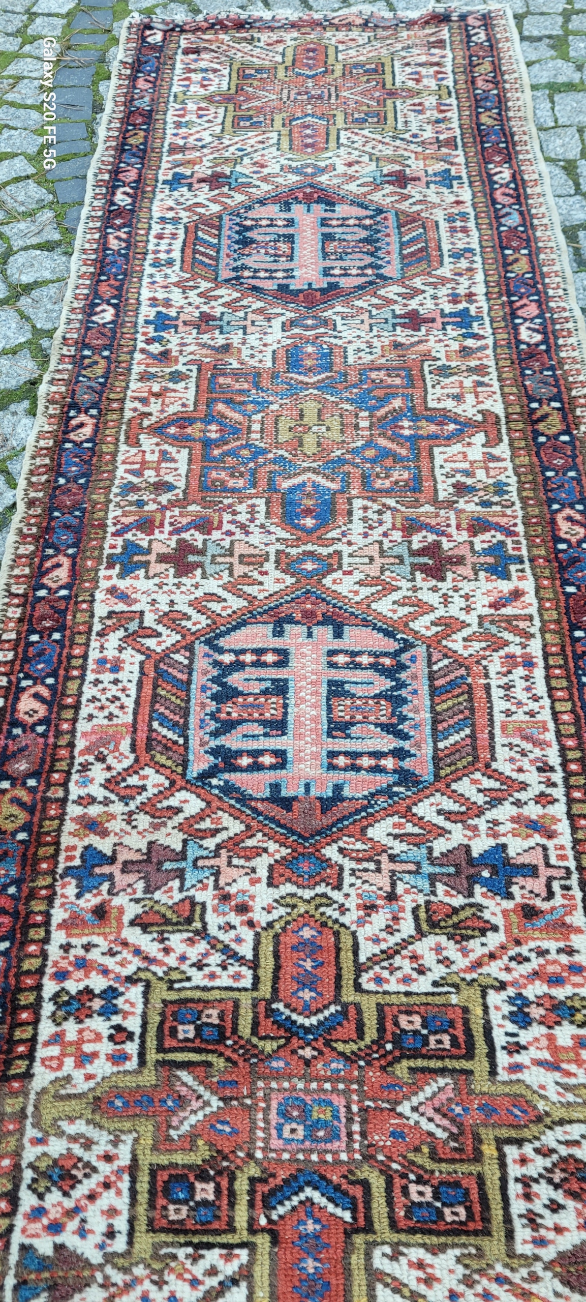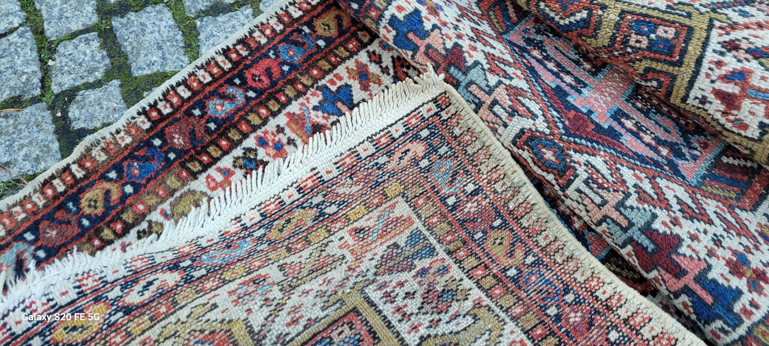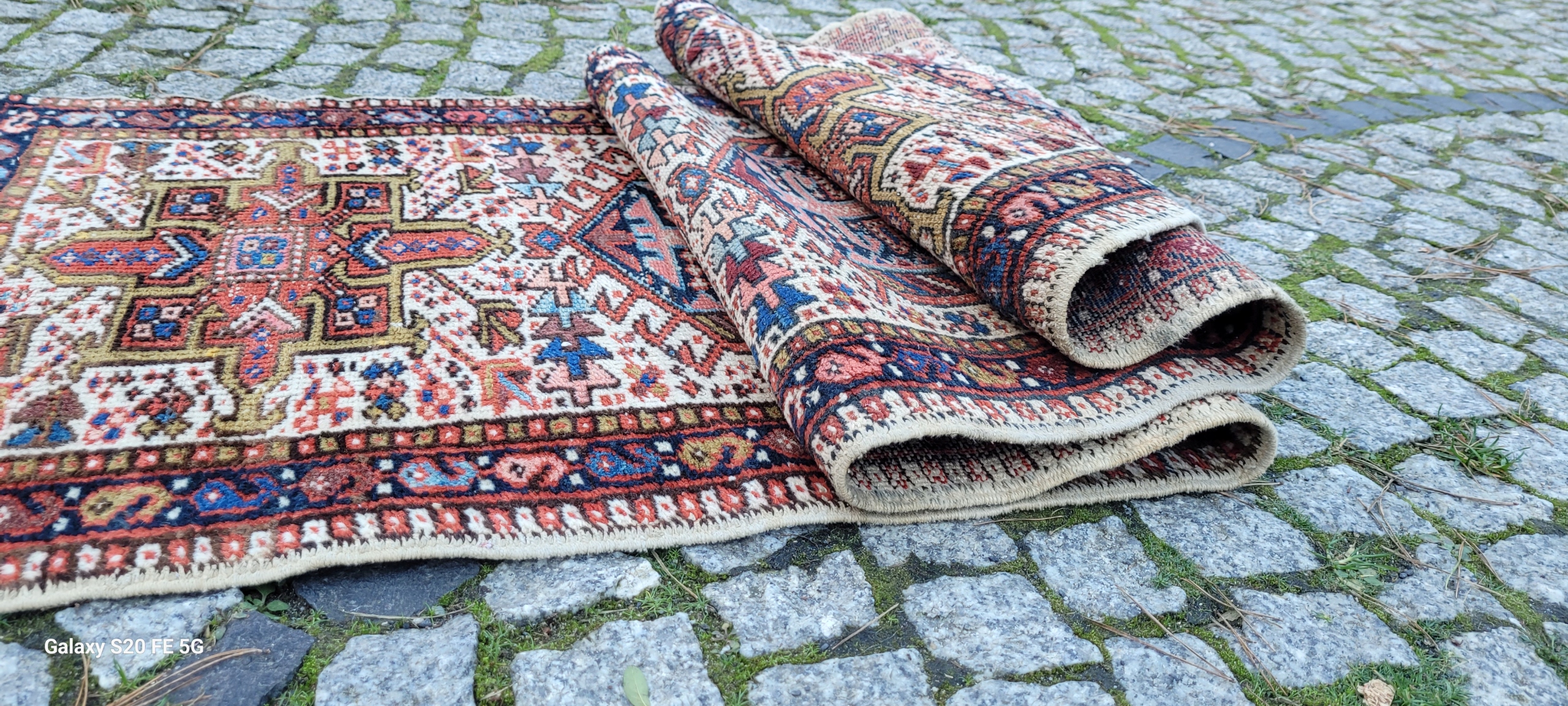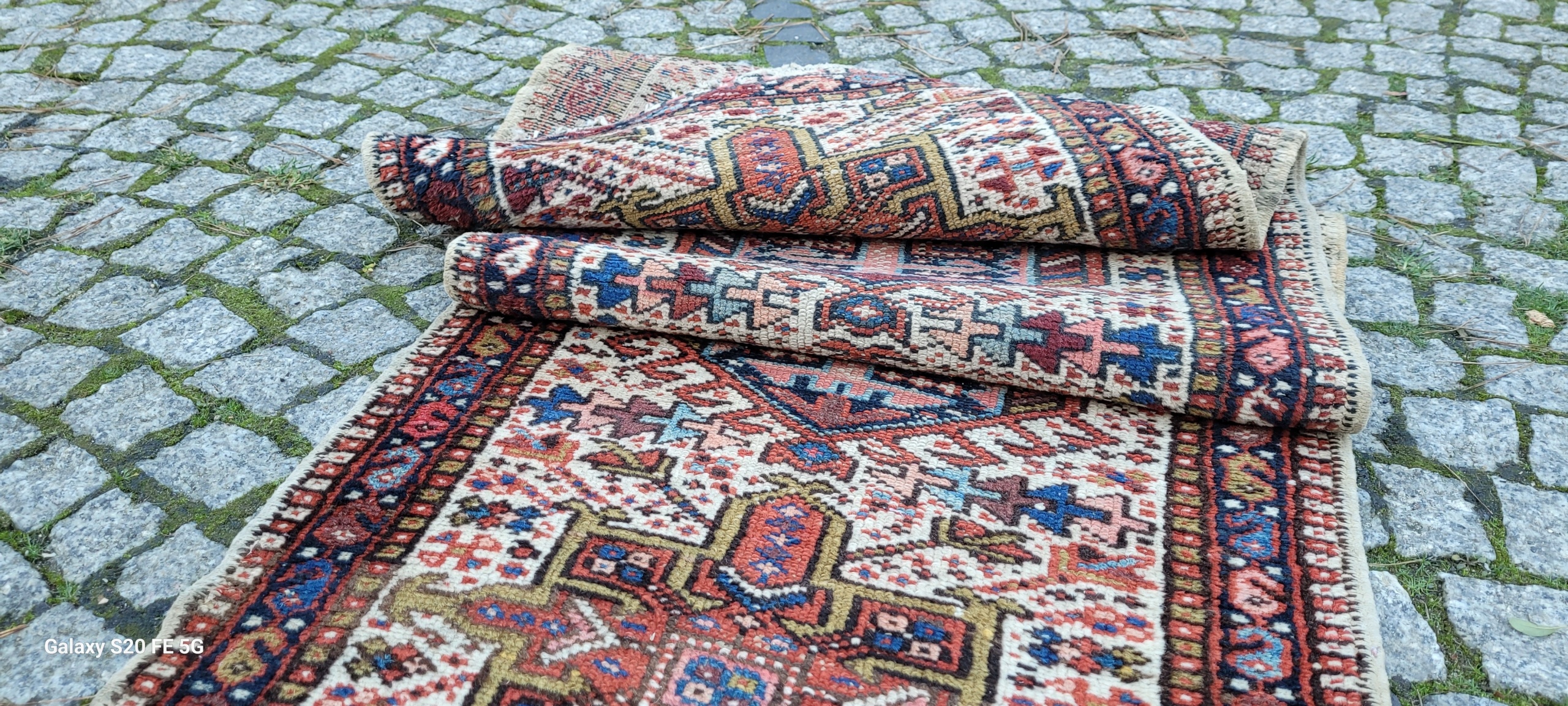 Перський старовинний килим Heriz-Garayeh. Виткана вручну з вовни найвищої якості. Характеризується компактним, приємним на дотик флісом і красивими потертими кольорами та візерунками. Зберігся в стані, який видно на фото. Має потертий фліс.