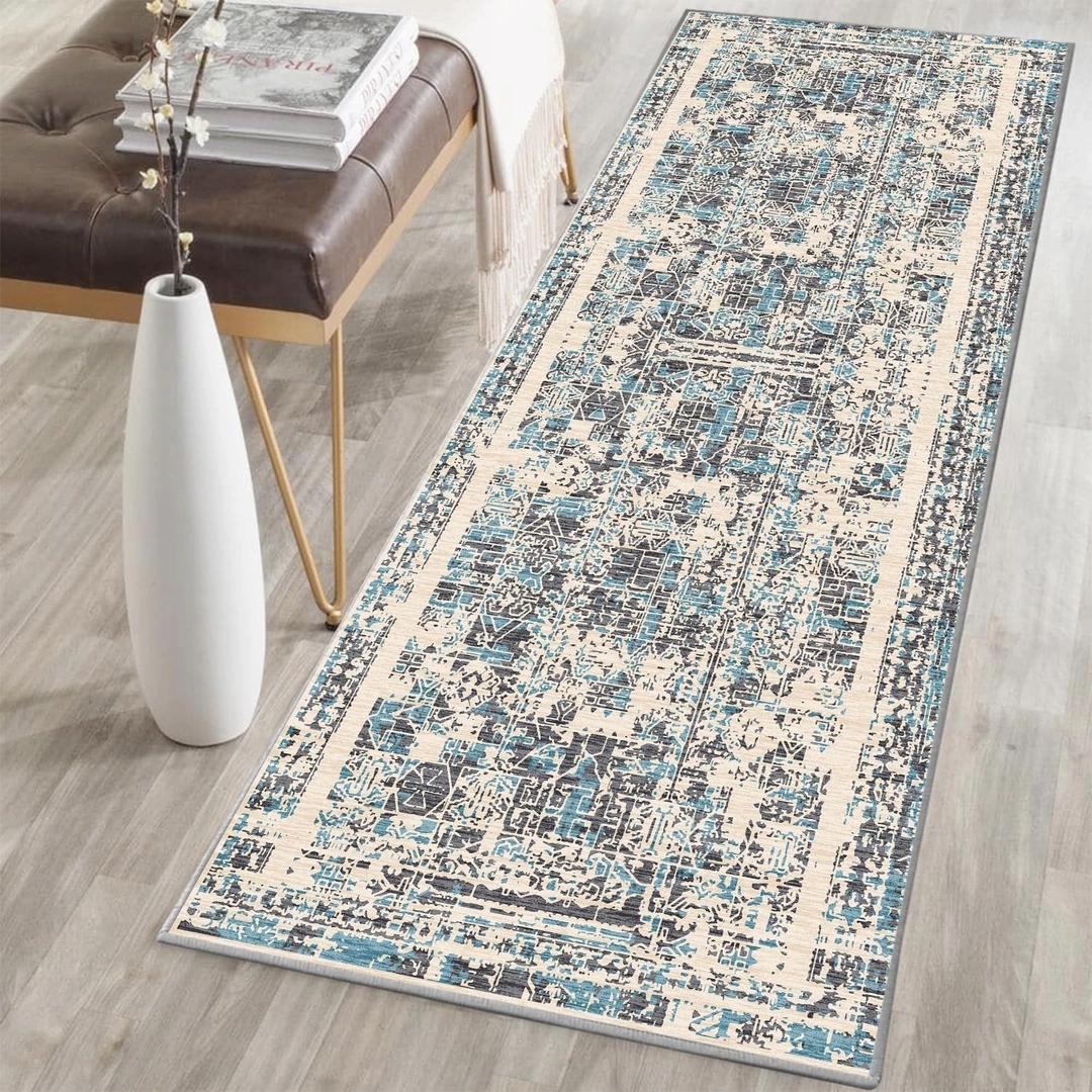 Пропонуємо сучасний килимок для передпокою розміром 80х120 см, який гармонійно поєднує естетику з функціональністю. Його унікальний вінтажний малюнок у відтінках бежевого, блакитного та темно-синього ідеально вписується в різноманітні інтер’єри – від мінімалістичного скандинавського до затишного бохо.