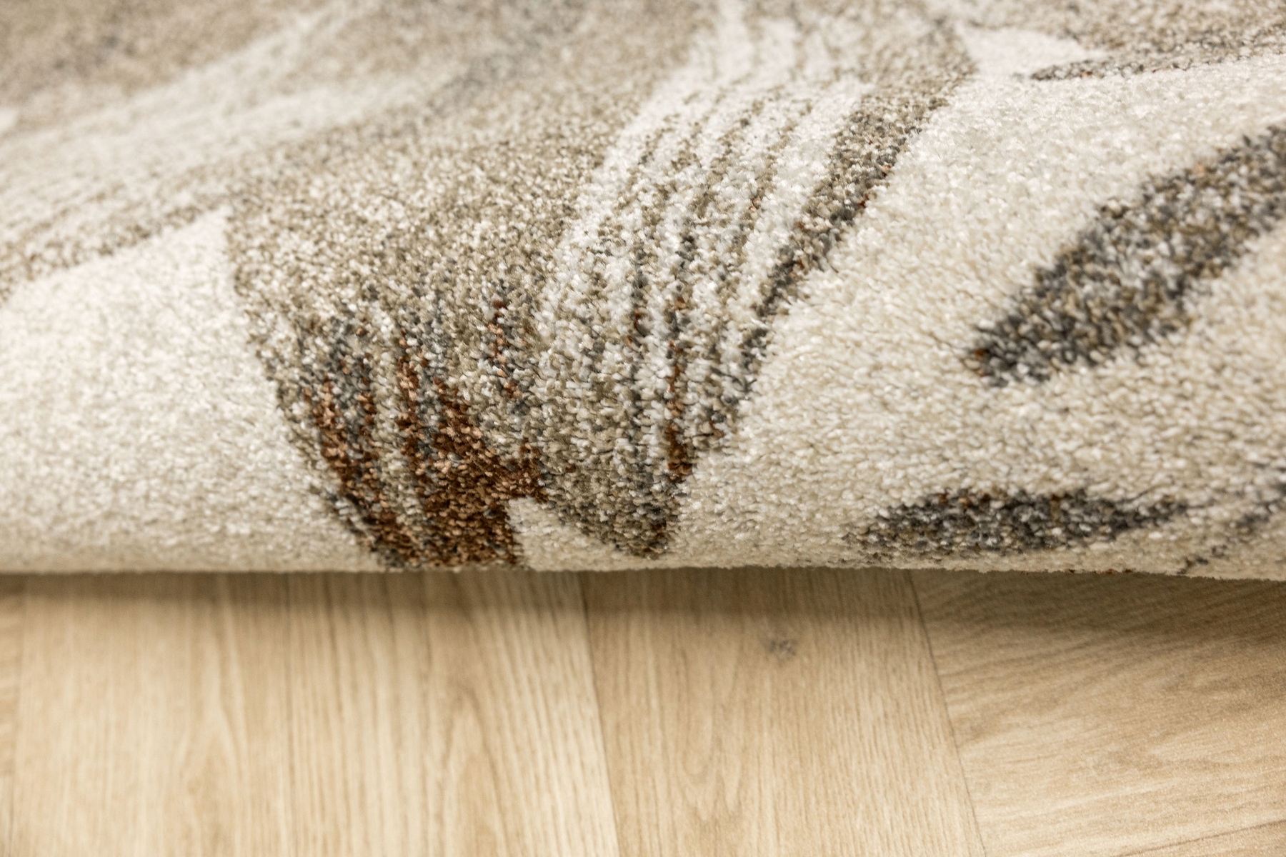 М'який і приємний на дотик килим Ponte з ворсом, прикрашеним ботанічним візерунком коричневого, сірого з акцентами кремового, сріблястого, бежевого і чорного. Низ оброблений джутом.