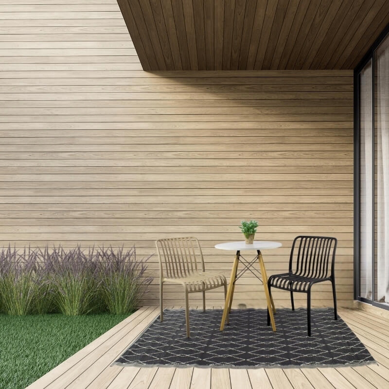 килим, виготовлений з поліпропілену, відомий своєю силою, ідеально підходить для місця, що піддаються зміні погодних умов. Він стійкий до вологи, ультрафіолетового випромінювання та вицвітання, що забезпечує тривалий естетичний зовнішній вигляд.