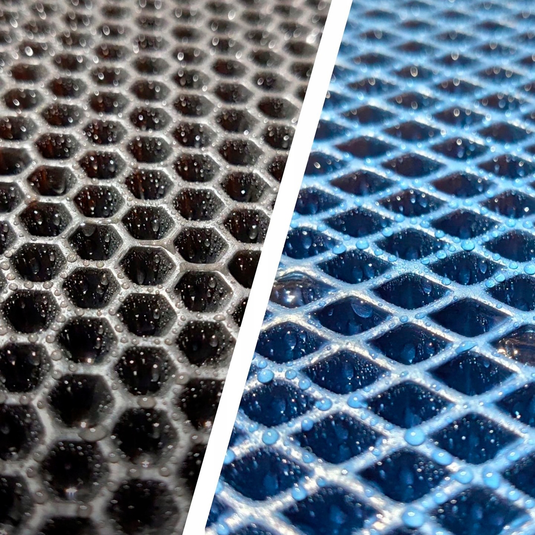 Килимки EVA виготовляються з гнучкого полімеру нового покоління під назвою EVA (етиленвінілацетат). Завдяки своїй комірчастій структурі килими з ЕВА ефективно затримують всі види забруднюючих речовин у своїх клітинах.