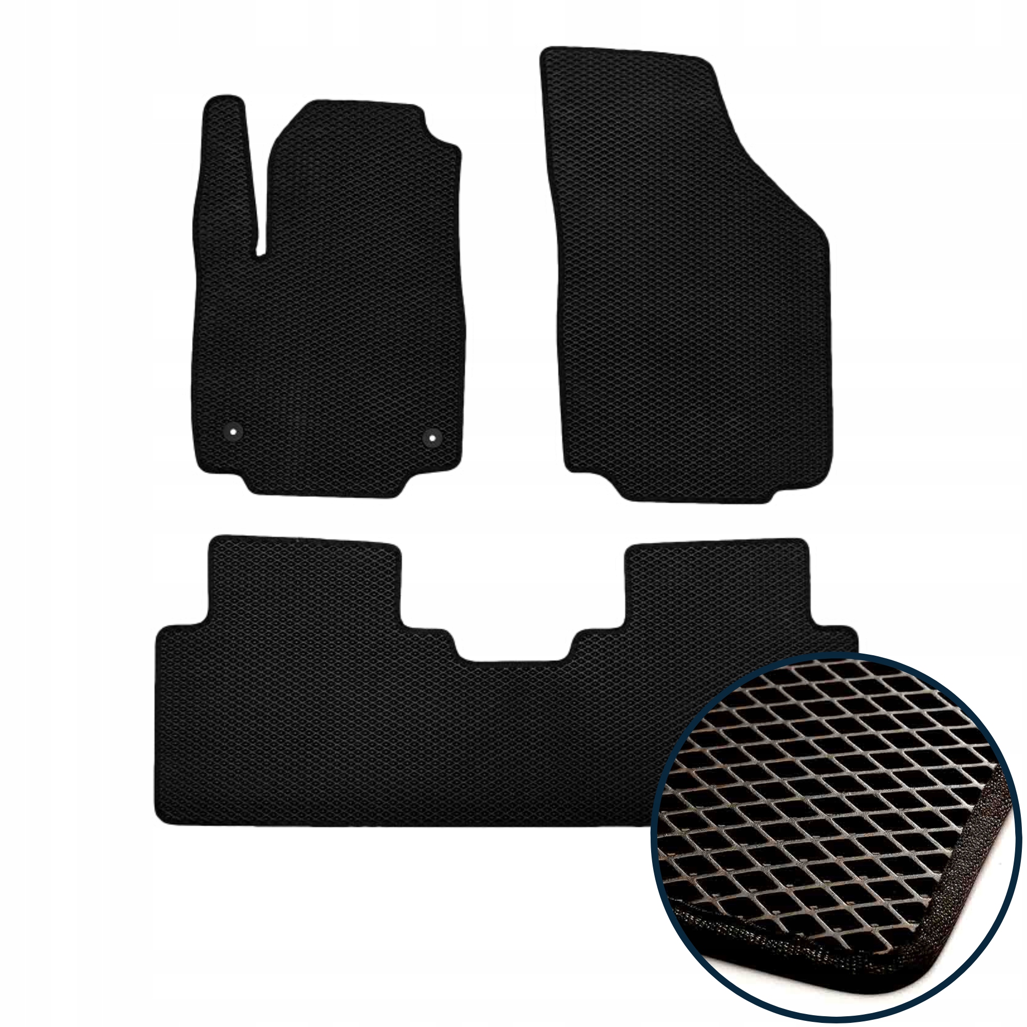 - З килимками, виготовленими із сучасного матеріалу EVA, ви легко утримуєте свій автомобіль у чистоті. Унікальна форма осередків килимів глибиною 6 мл утримує будь-який бруд і воду, запобігаючи їх витіканню за межі килима