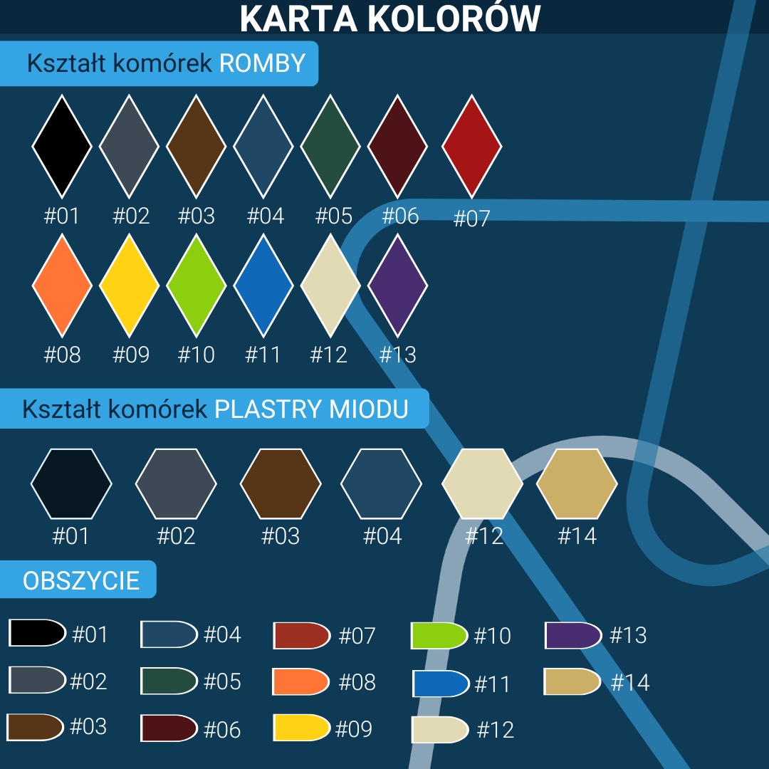 Як виробник килимів, ми маємо широкий вибір кольорів і двох типів форм комірок: «ромб» і «стільники».