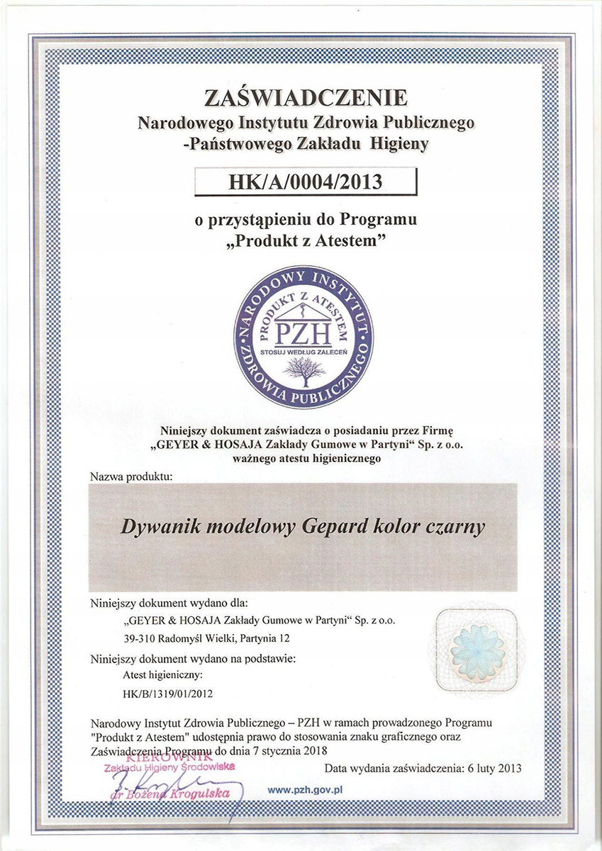 - Автомобільні килимки Geyer & Hosaja – єдині в Польщі, які мають гігієнічний сертифікат Національного інституту гігієни (при Національному інституті громадського здоров’я)
