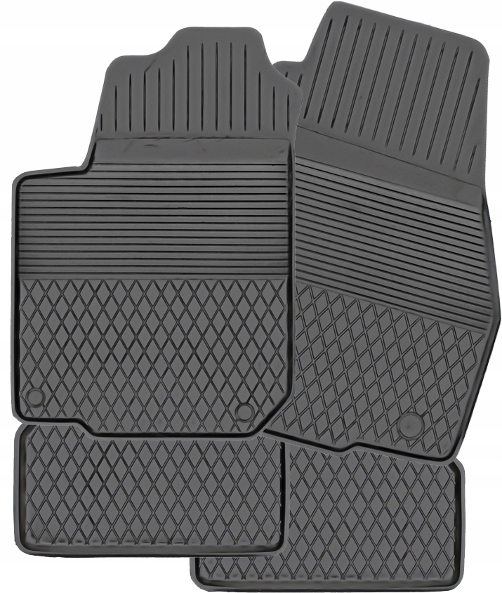 Пропоновані гумові килимки є універсальними килимками на основі замінників, адаптованих до передньої та задньої моделі автомобіля, вказаної в розділі «Підходить до». Килимки виготовлені з якісної гумової суміші чорного (матового) кольору, яка не виділяє неприємного запаху (килимки мають нейтральний запах гуми). Килимки мають вищий захисний край приблизно 2 см, який призначений для захисту оригінальної оббивки автомобіля від бруду або затоплення. Вся поверхня килимків захищена додатковою сіткою, яка захищає килимки від переміщення в автомобілі.
