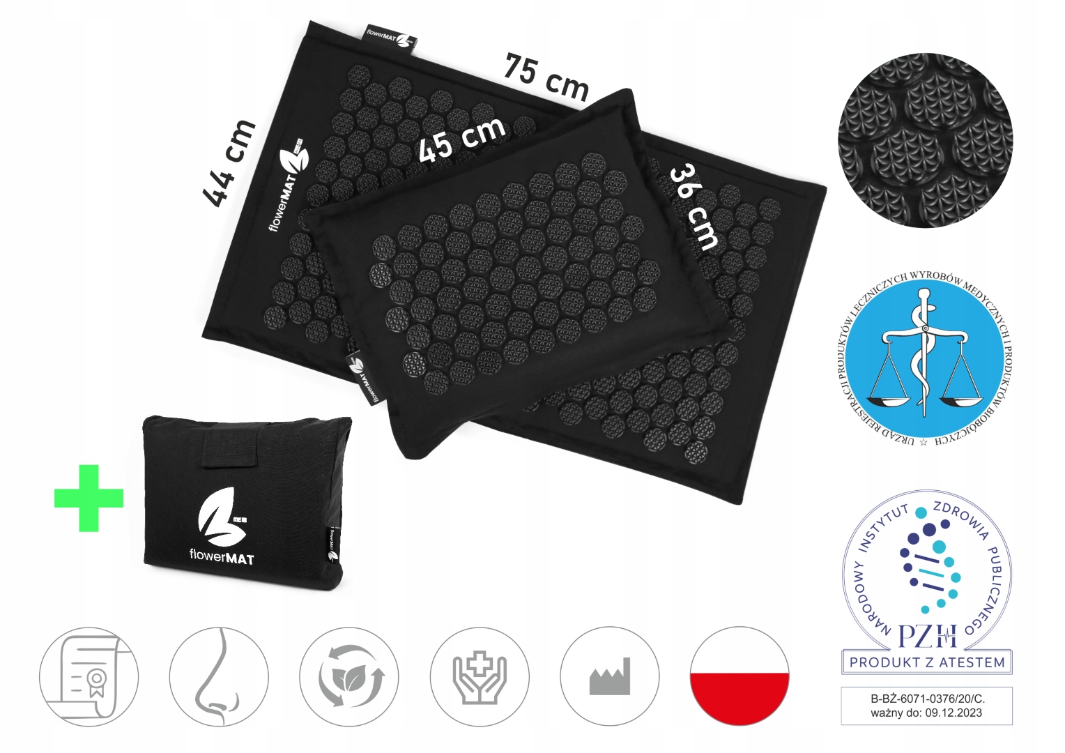 Набір для точкового масажуflowerMATвід торгової марки ALL4FIT - це сертифікований медичний виріб із сертифікатом якості для здоров'я ПЖ. Продукт пройшов повну перевірку і безпечний для шкіри. Наша продукція зареєстрована в Управлінні реєстрації лікарських засобів, виробів медичного призначення та біоцидних препаратів. Завдяки цьому ви можете бути впевнені, що їх використання абсолютно безпечно. Шипи, тканина та наповнювач, які використовуються у виробництві, перевірені та можуть використовуватися безпосередньо на голій шкірі. Використовувані матеріали безпечні як для здоров'я, так і для навколишнього середовища. Килимки та подушки ALL4FIT мають доведені лікувальні властивості. Обирайте якісну продукцію польського бренду ALL4FIT! Наші килимки та подушки flowerMAT мають антиалергічні властивості.