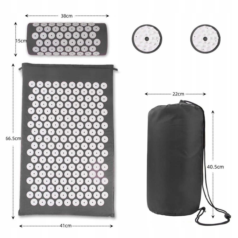 Включає сумку, яку можна прокатати та приховувати в сумку. Продукт важить лише 0,5 кг, тому він дуже маленький і легкий, завдяки якому ви можете легко взяти його з собою до офісу або студії йоги. Універсальний розмір акупунктурного килимка становить 62 х 38 см (довжина х ширина), підходить для людей до 185 див.