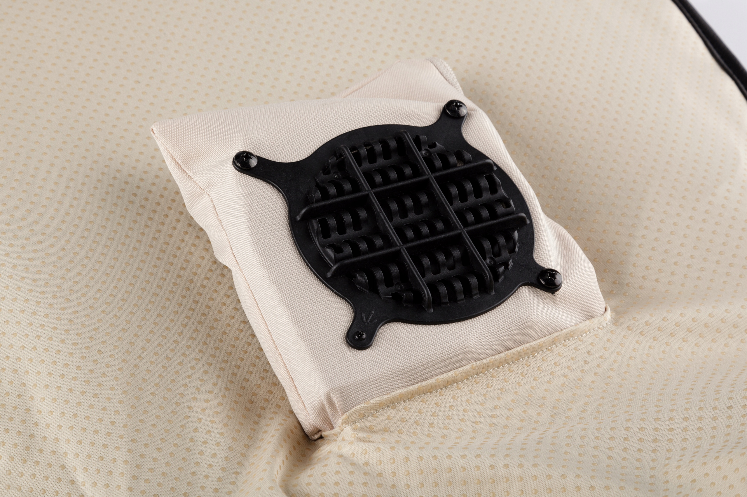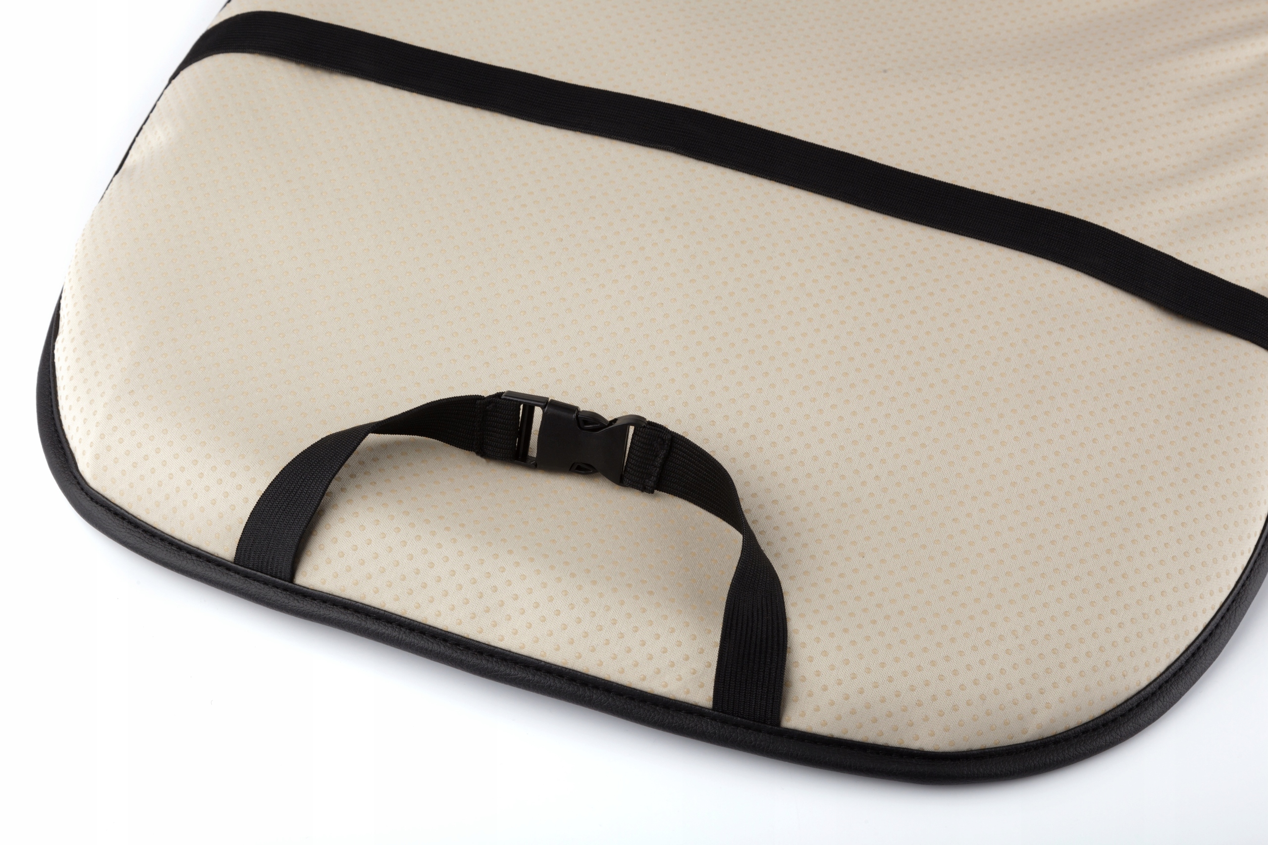 Килимок оснащений еластичними кріпильними ременями, які можна легко закріпити на автокріслі. Завдяки цьому ви можете підлаштувати його під будь-який тип автомобіля. Додатково виріб виконано з повітропроникної розпірної тканини. Килимок також має нековзку поверхню, яка забезпечує стабільне положення під час руху.