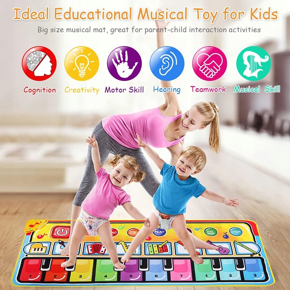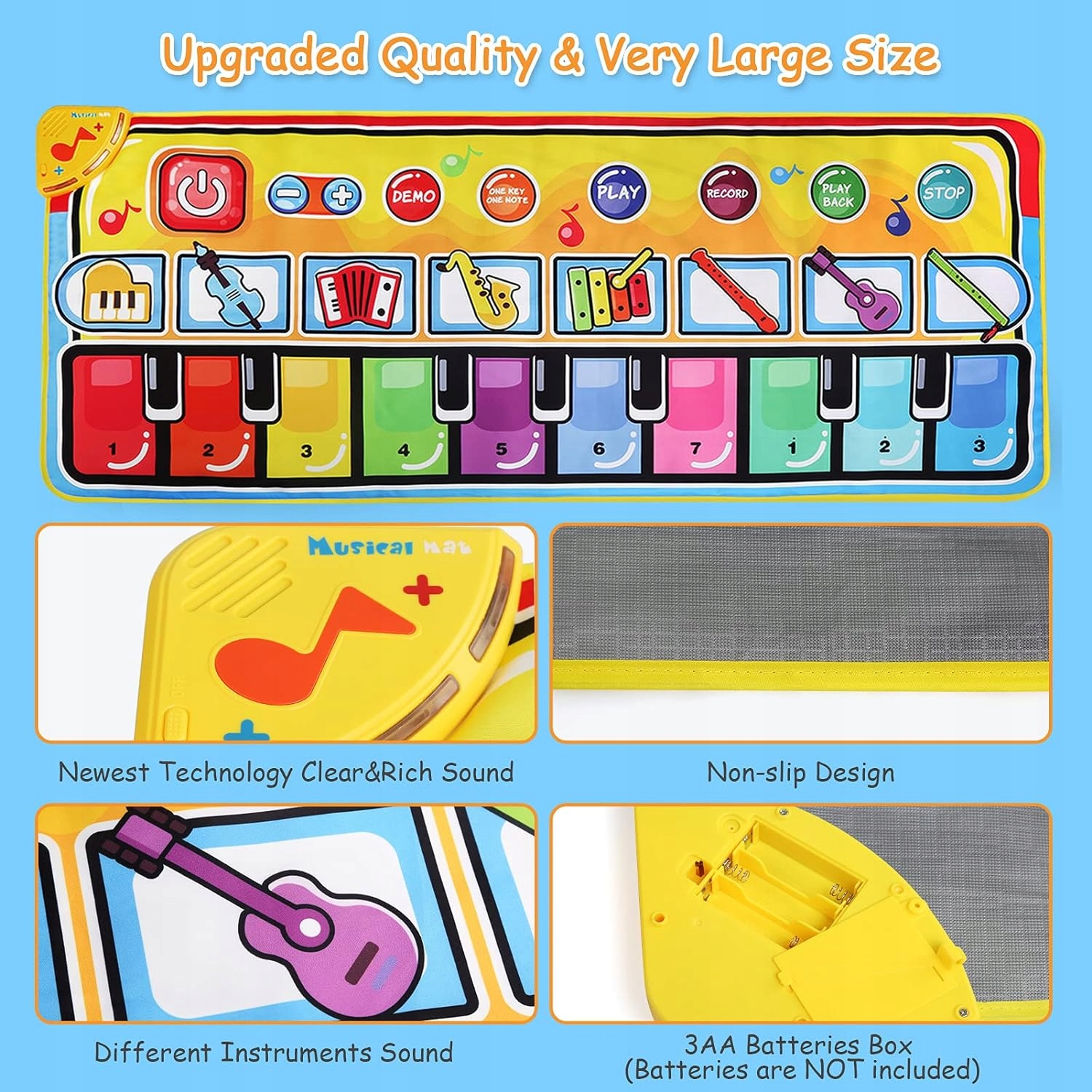 - Барвистий і тривимірний килимок для піаніно привертає увагу дітей і допомагає дітям розпізнавати кольори, інструменти та клавіші піаніно. . Високоякісний звуковий ефект фортепіано відновлює справжній звук фортепіано, якість звуку чиста, а гарну музику легко грати. Музичний килимок винагороджує природні ногами та дотиками дитини, що стимулює творчі здібності дитини.