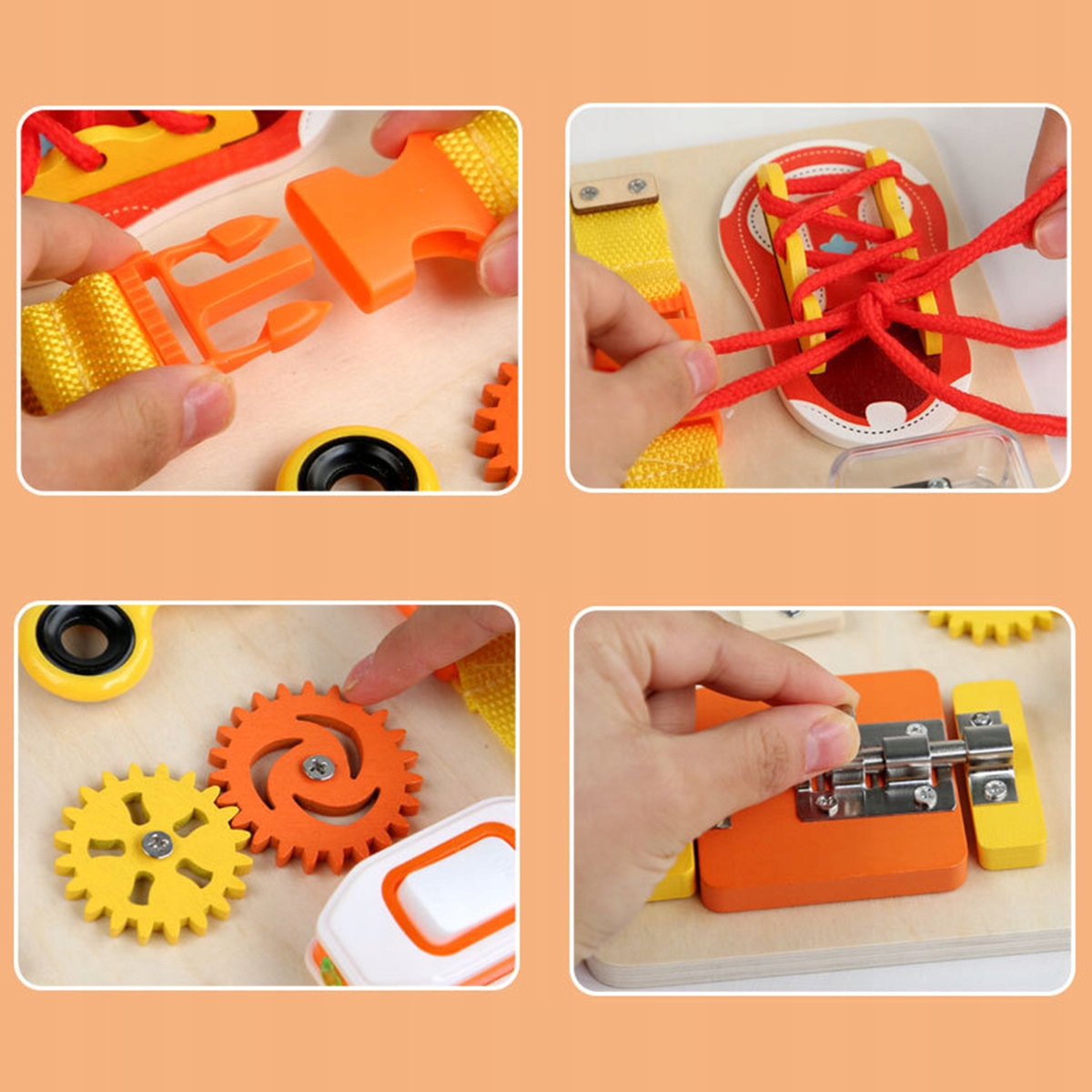 - Дерев'яна дошка для занять містить 9 різних занять, які захоплять вашу дитину та допоможуть їй розвинути дрібну моторику.