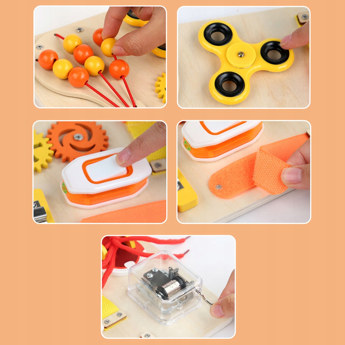 Дії: намистини, вертушки, ремені безпеки з пряжками, шнурки, дверні засувки, шестерні, перемикачі, застібки-липучки та музичні шкатулки