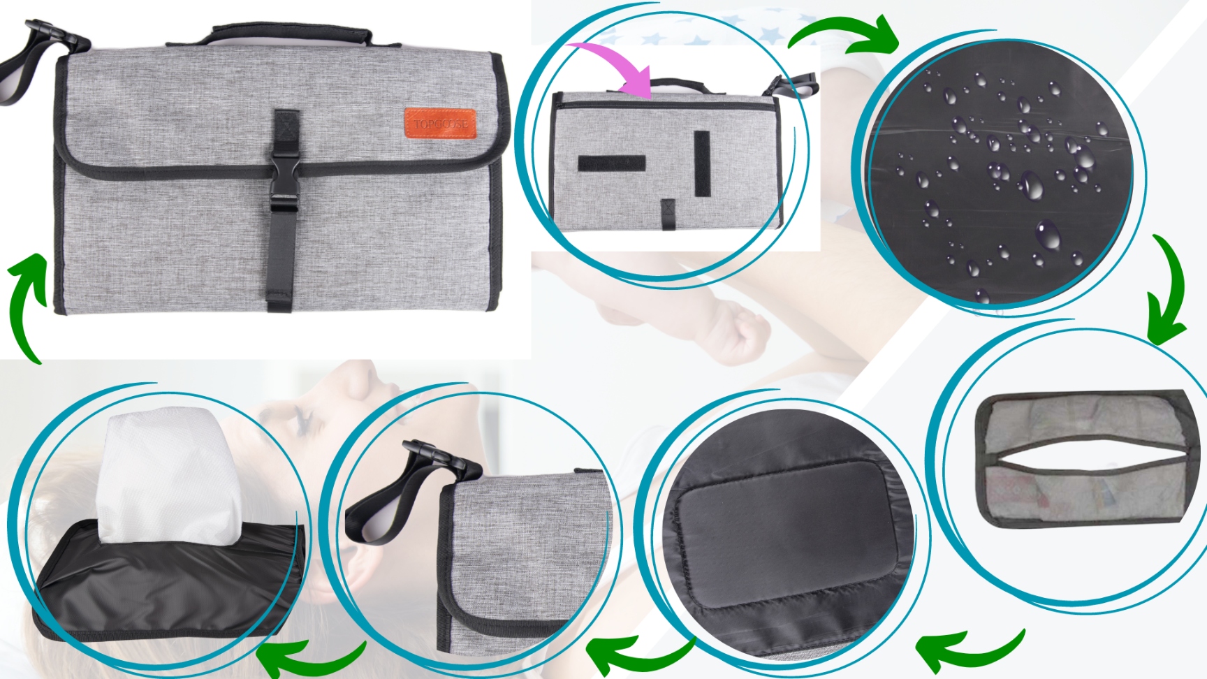 - ✅Завдяки використанню липучки ви також можете прикріпити його до підголівника крісла та витягнути одну з внутрішніх кишень , Ви завжди можете мати під рукою серветки для малюка