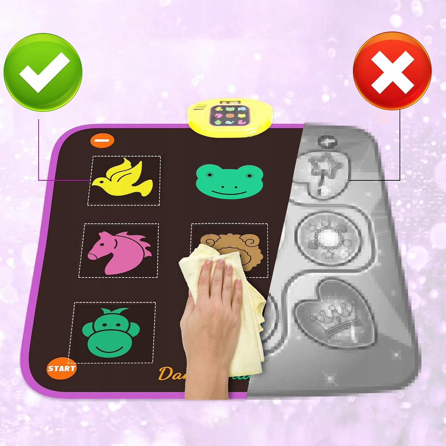 - Покращений танцювальний килимок викликатиме аплодисменти після успішних змагань, тим самим підвищуючи впевненість у собі та ентузіазм вашої дитини. Покращуйте координацію рук і ніг, підвищуйте інтелект і покращуйте фізичну форму вашої дитини в смішний спосіб. Ідеальна іграшка для дітей.