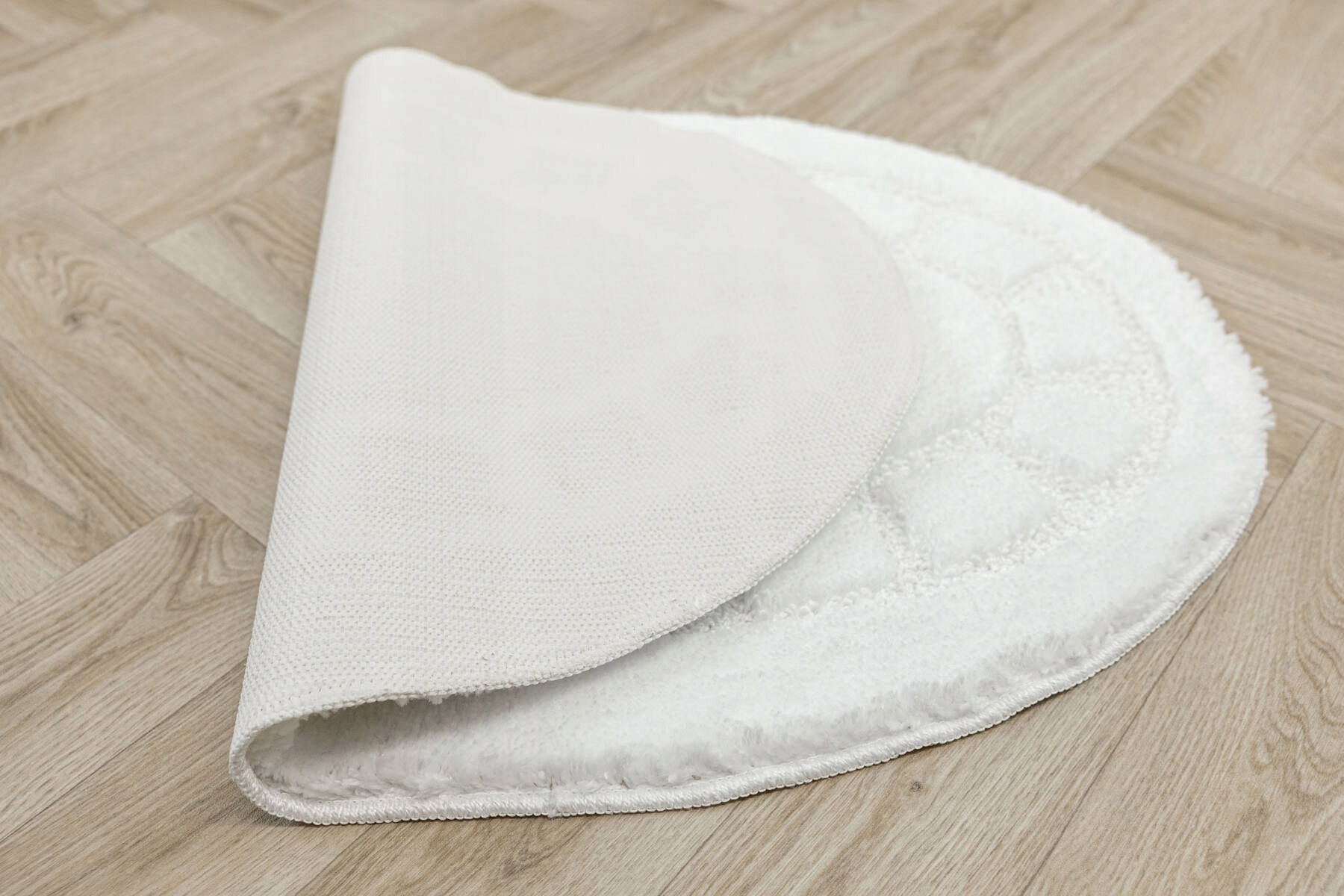 Килимок для ванної Ocean овальний з м'яким і приємним на дотик дворівневим ворсом білого кольору, з геометричним малюнком і неслизьким низом.