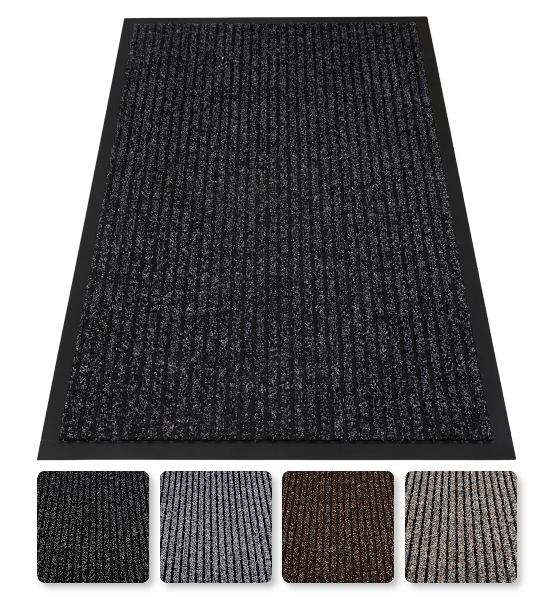 Вхідні - це високоякісні, професійні килимки з дуже широким спектром застосування. Завдяки смугастій структурі вони чудово збирають будь-який бруд, наприклад, бруд, воду чи сніг. Вони легко миються та стійкі до тривалого та інтенсивного використання. Дно виготовлено з м’якого ПВХ, що гарантує, що килимок міцно прилягає до землі та не рухається. Вхід можна використовувати як в приміщенні, так і на вулиці. Вони ідеально підійдуть для дому, офісу, установи чи компанії. Придверні килимки мають гумовий край шириною близько 1,5 см, завдяки чому вони не деформуються, а текстильний шар не розтирається.