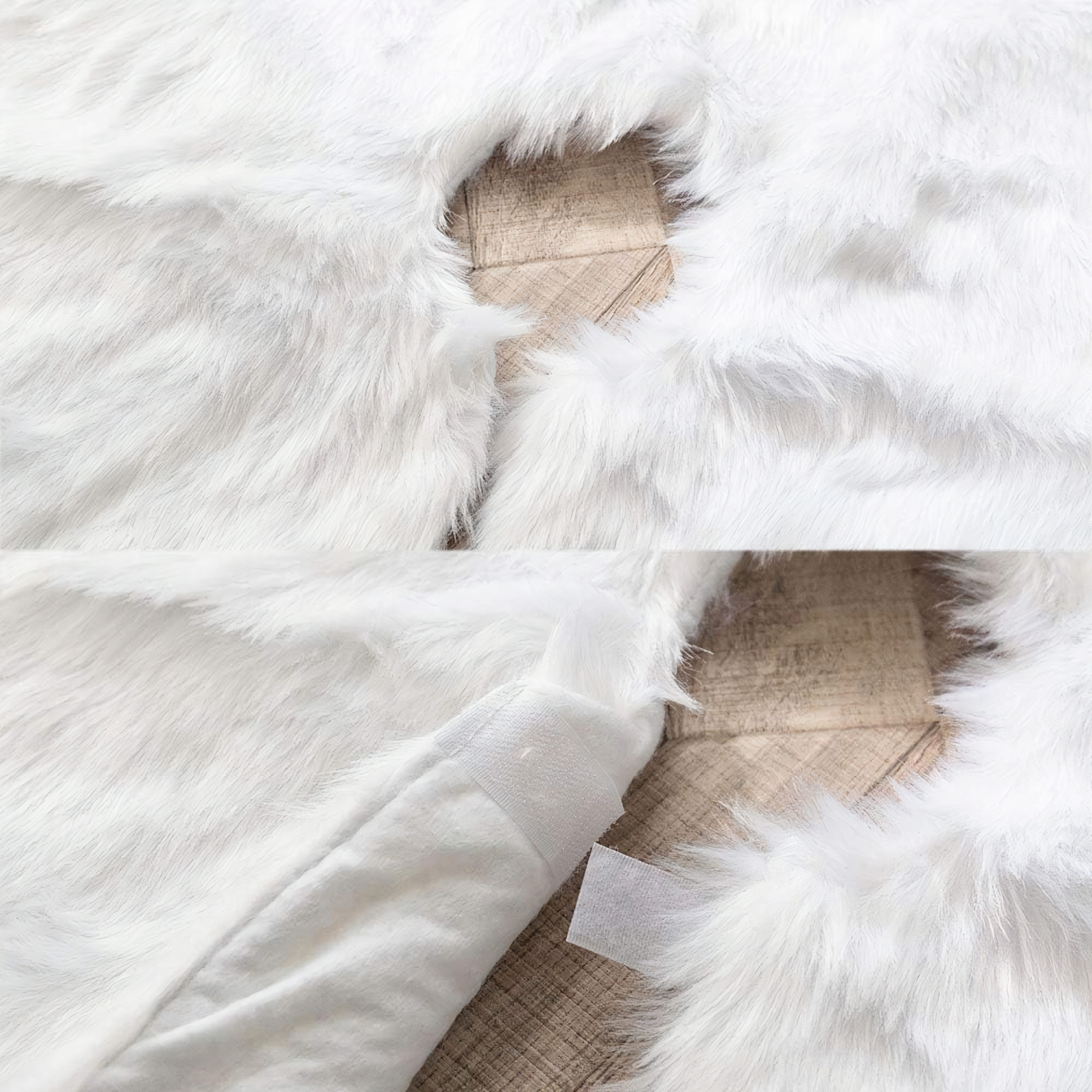 Килимок на ялинку виготовлений із зручного та приємного на дотик матеріалу, що нагадує хутро. Це робить його надзвичайно м’яким і ніжним. Наш килим кріпиться за допомогою двох білих липучок, які після прикріплення стають практично непомітними.