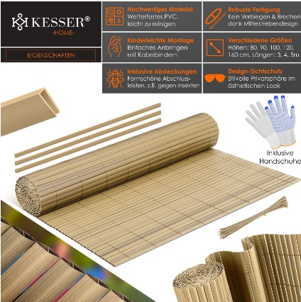 Маркіза KESSER® з міцного ПВХ – це практичне та естетичне покриття, яке захищає від сторонніх очей, сонця та вітру, і водночас надає простору елегантний природний вигляд. Ідеально підходить для саду, балкона та тераси - забезпечує приватність і водночас виконує декоративну функцію.