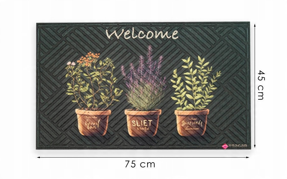 Килимок виготовлений із синтетичного волокна з прогумованим дном. Має чудові протиковзкі властивості. Ефективно очищає взуття та запобігає забрудненню підлоги. Ідеально підходить для зовнішнього використання, будинку, офісу чи квартири. Можна використовувати всередині і на вулиці - стійкий до погодних умов. Придверний килимок легко миється. Цікавий, рельєфний візерунок горщиків з квітами та написом "Ласкаво просимо" - чудово прикрасить під'їзд вашого будинку.