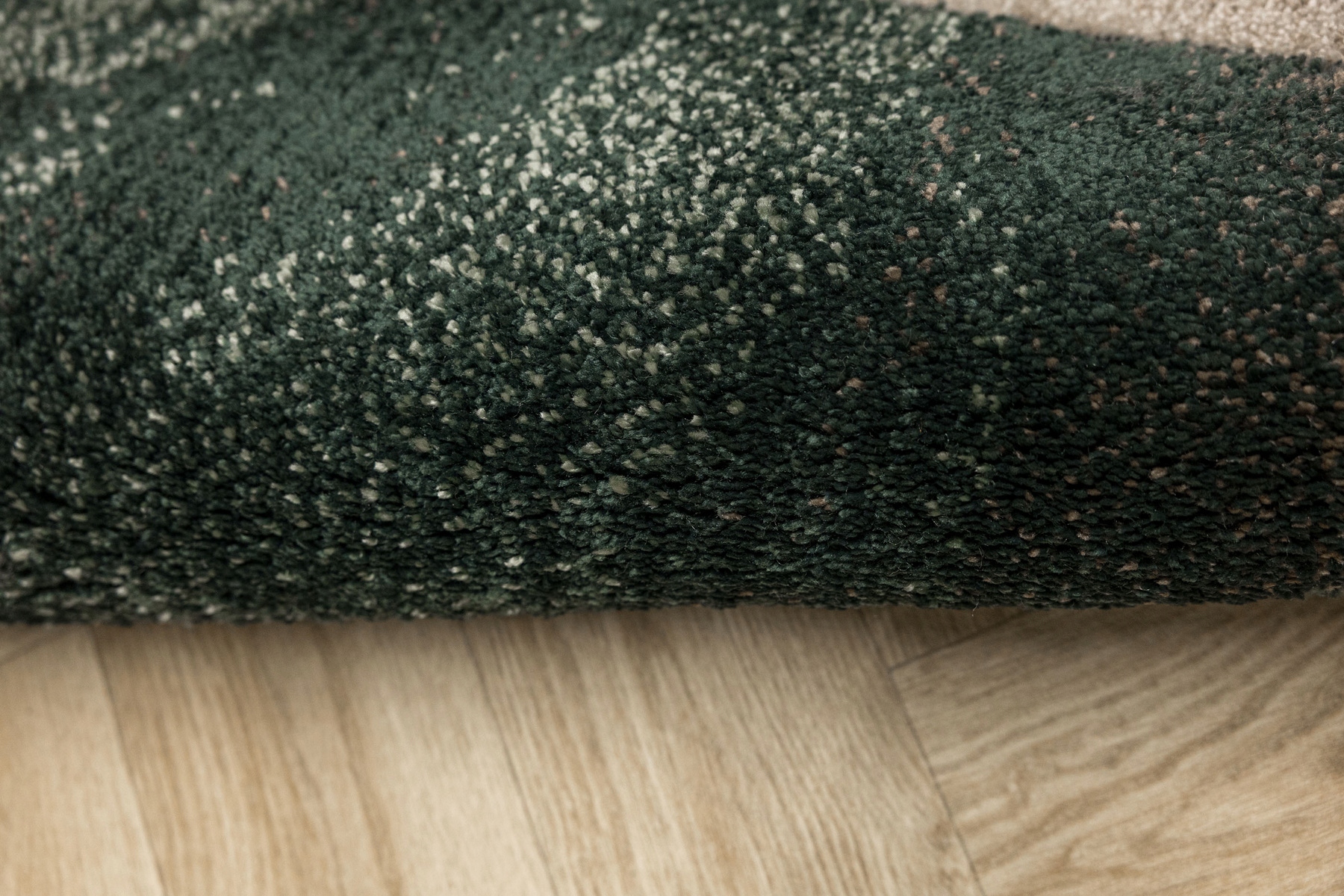 М'який і приємний на дотик килим Kandy з густим вирізаним ворсом, прикрашеним сучасним абстрактним геометричним візерунком у відтінках пляшково-зеленого, коричневого, бежевого та кремового, і низом з джуту.