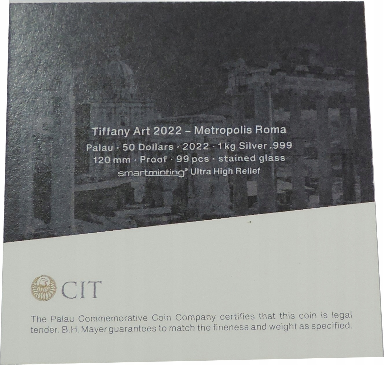 КІЛОГРАМ Ag999 - 50 ДОЛАРІВ 2022 PALAU- TIFFANY ART- METROPOLIS ROMA