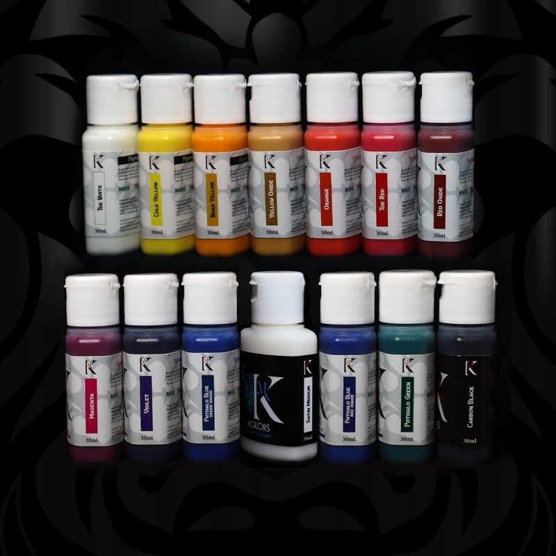 13 чистих пігментних акрилів і 1 атласне середовище, пляшка-крапельниця об’ємом 30 мл із відкидною кришкою, сталевою кулькою мішалки всередині кожного горщика